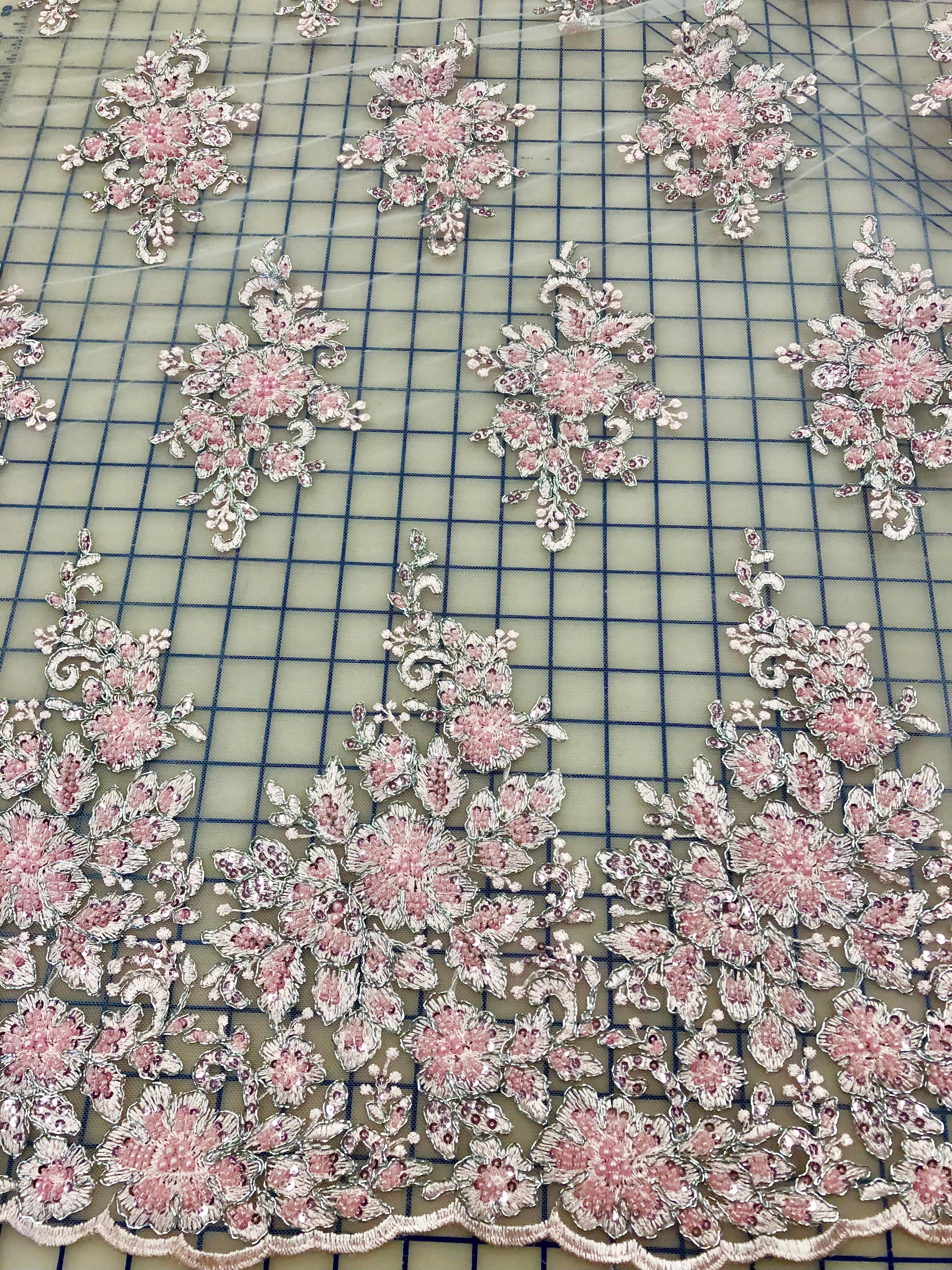 Priced per yard. Pink, silver-corded, beaded, embroidered lace. 52-inches wide.