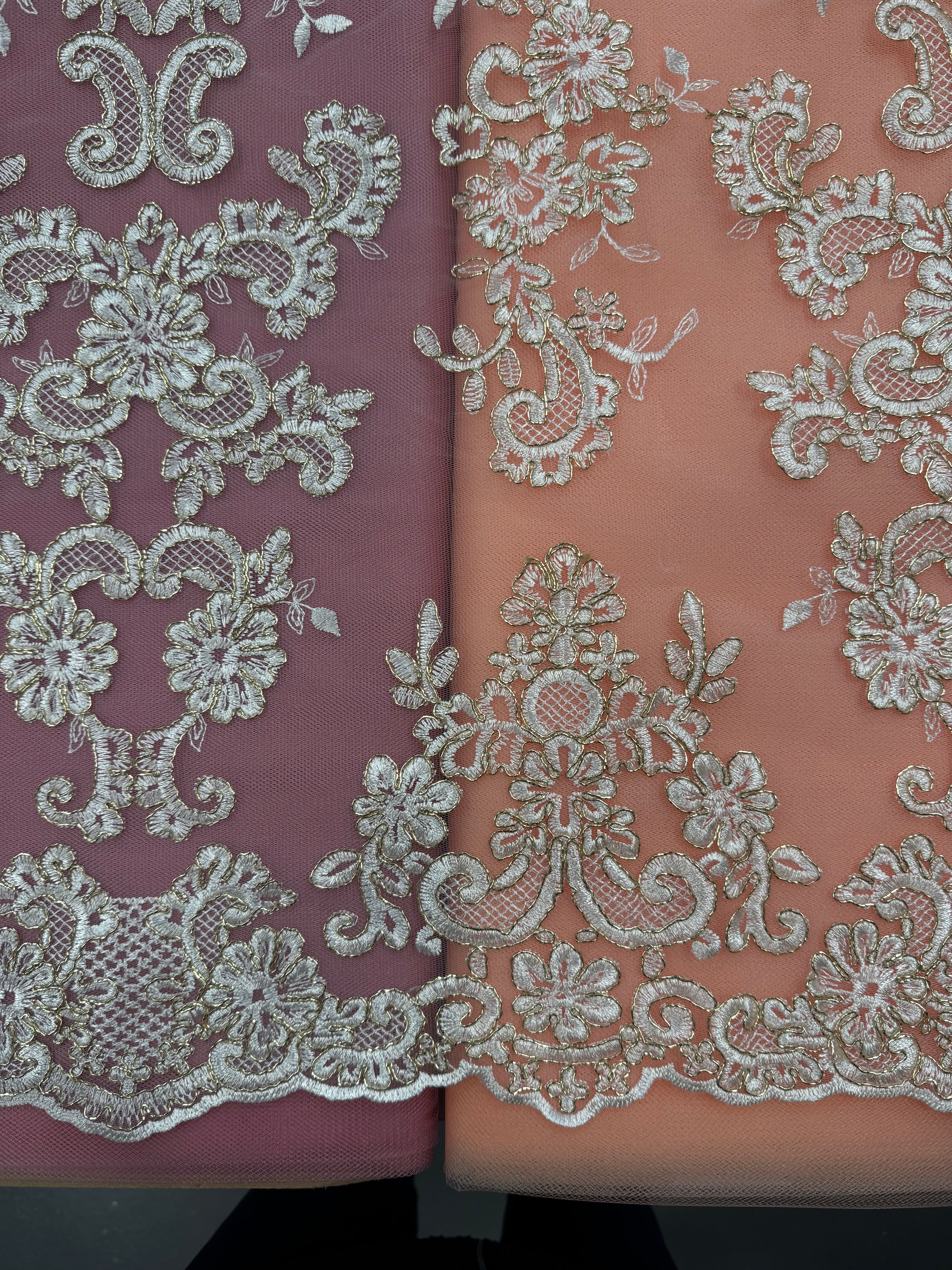 First picture of lace on both peach and dusty rose net.
