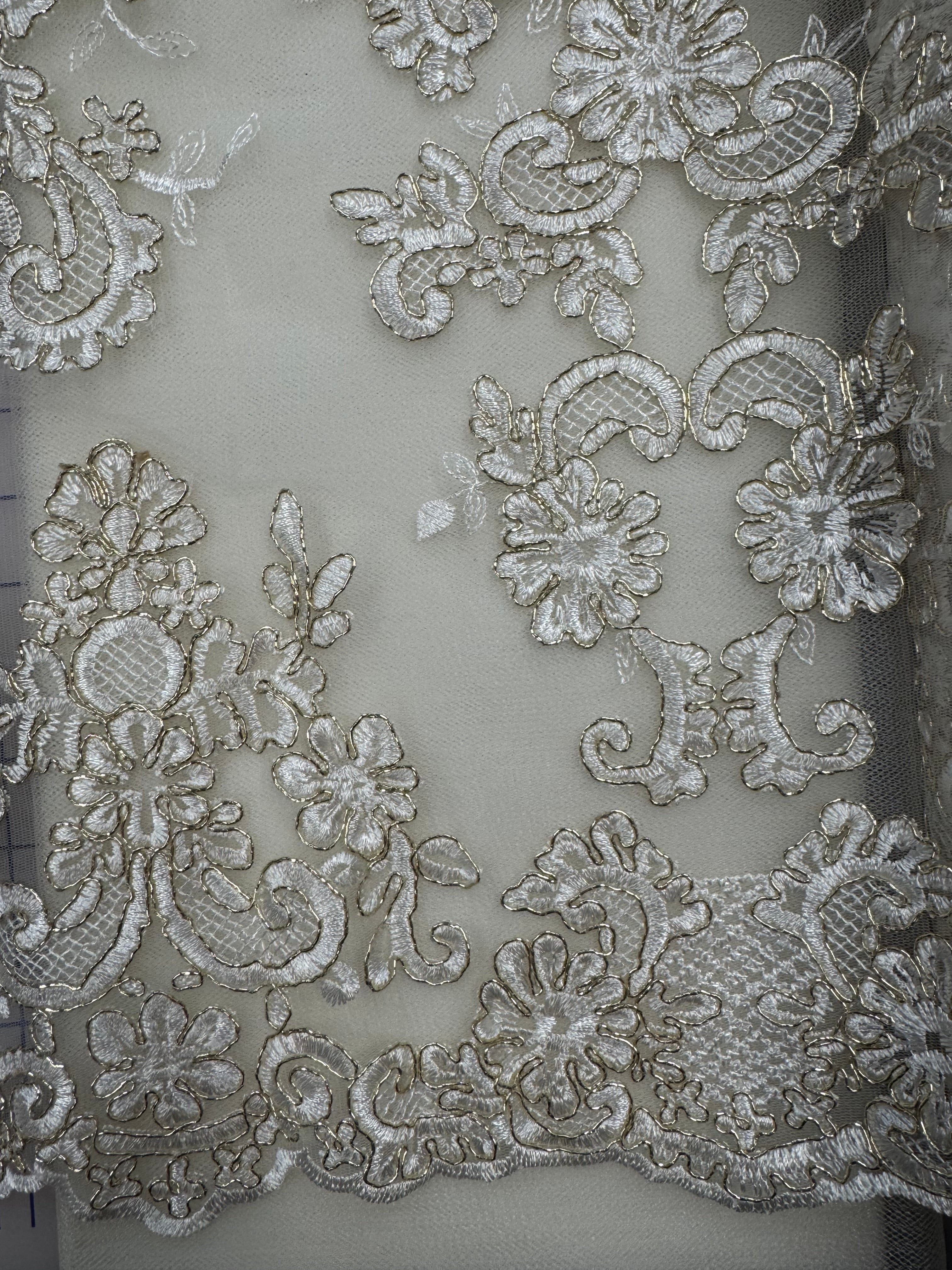 Priced per yard. Metallic gold on ivory, corded, embroidered lace. 52-inches wide.