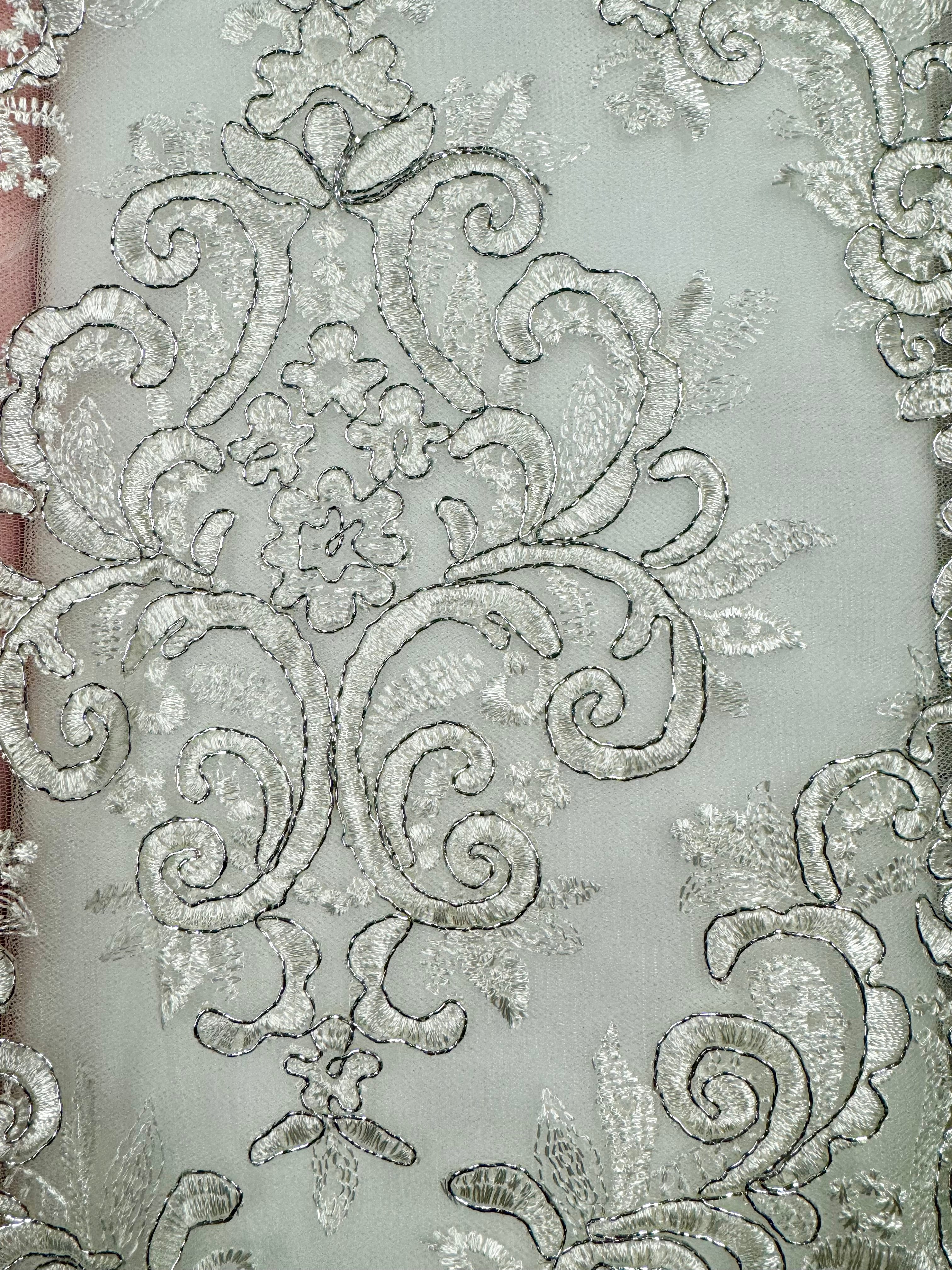 Priced per yard. Metallic silver on white, corded, embroidered lace. 52-inches wide.