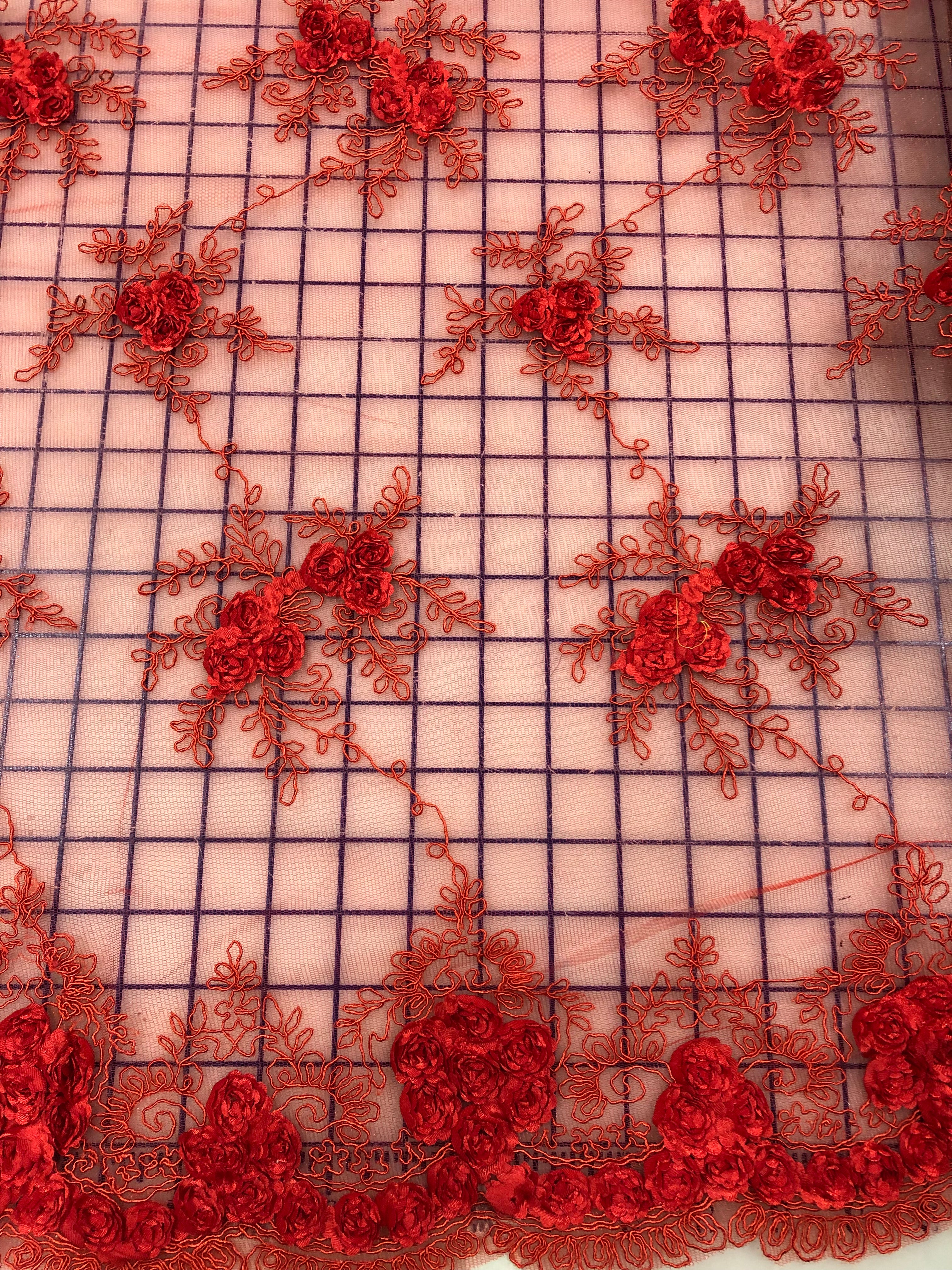 Priced per yard. Beautiful red lace with 3D flowers. 52-inches wide. Very lightweight.