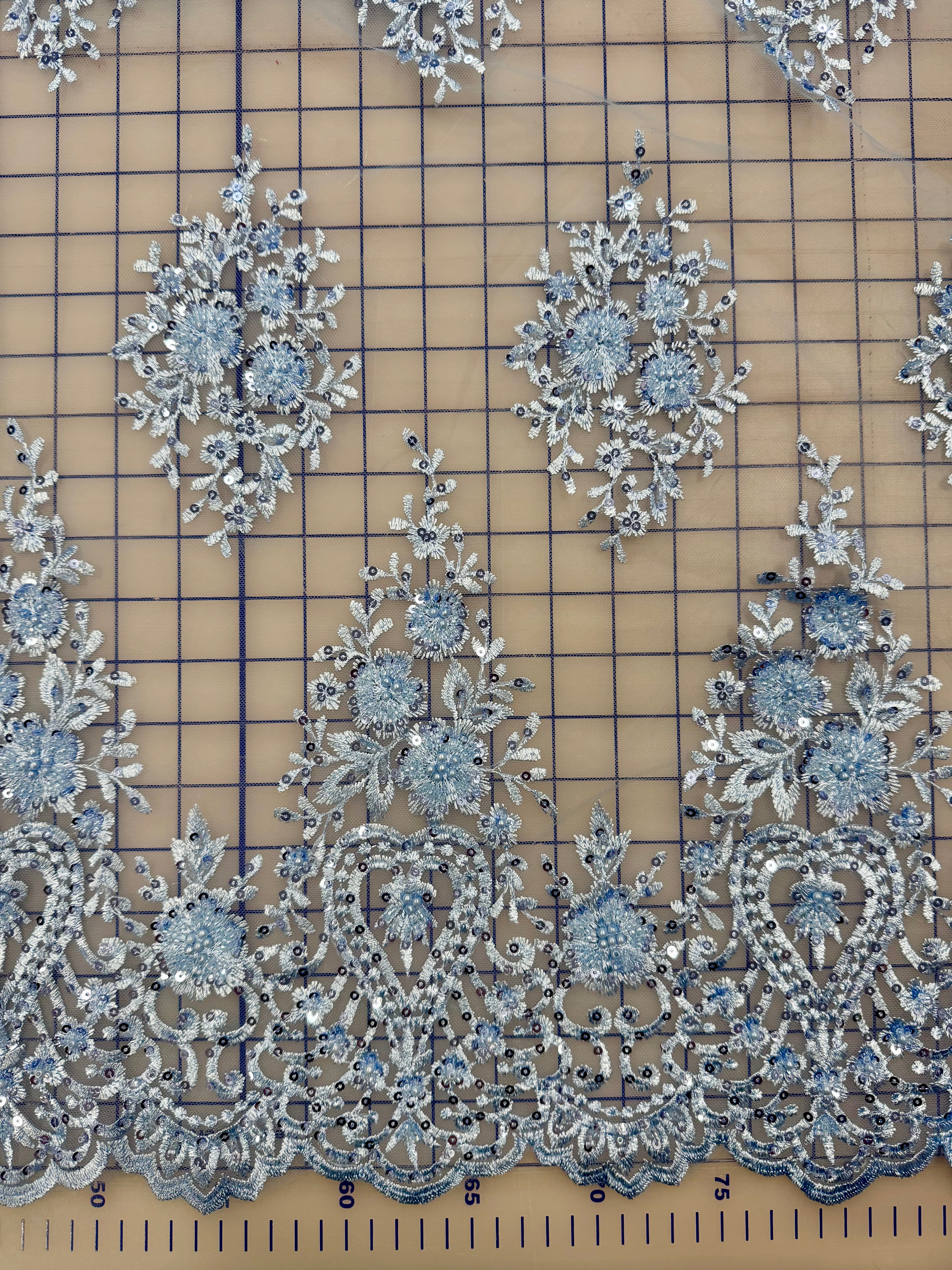 Priced per yard. Light blue, sequined, embroidered lace. 52-inches wide.