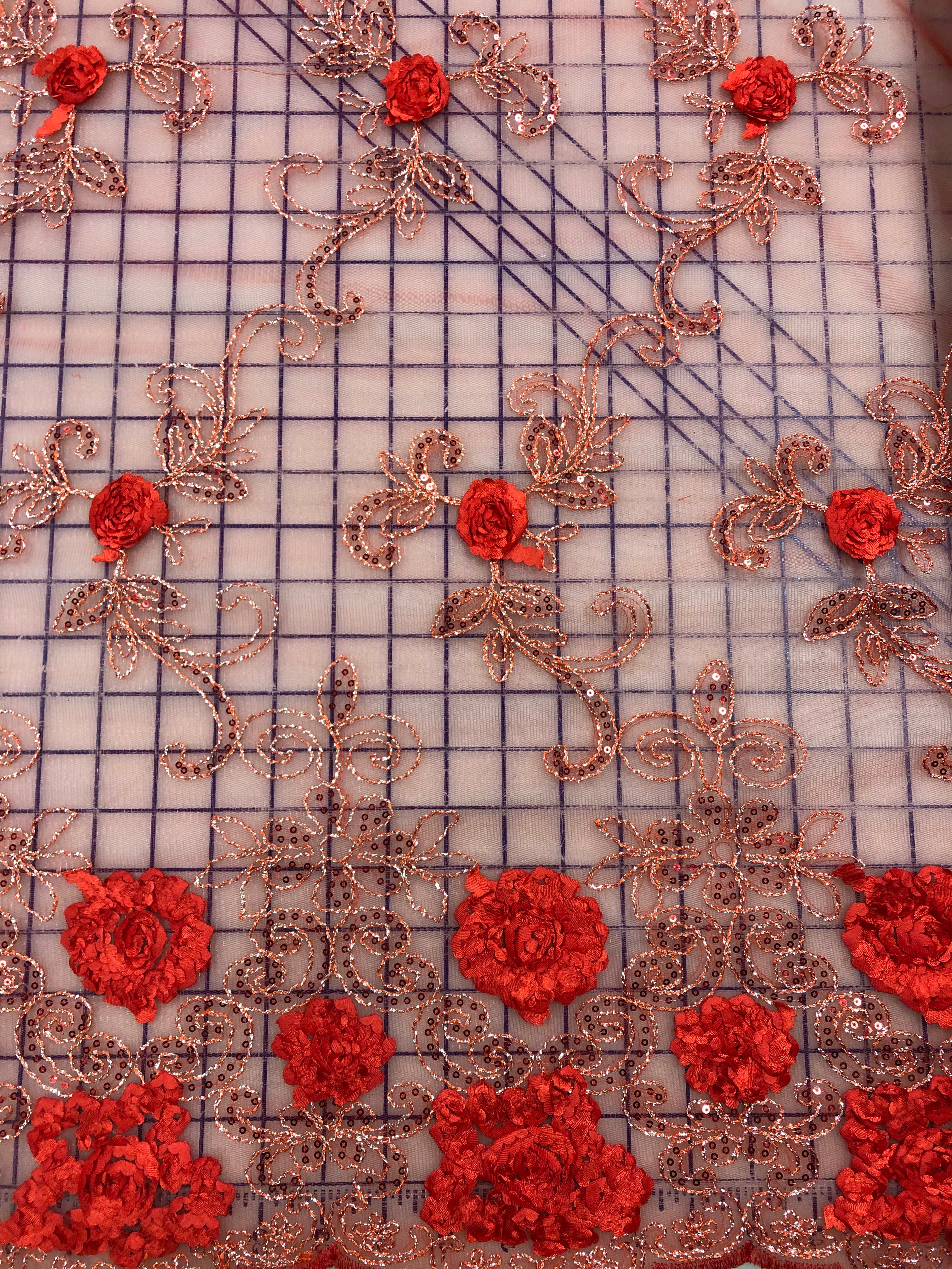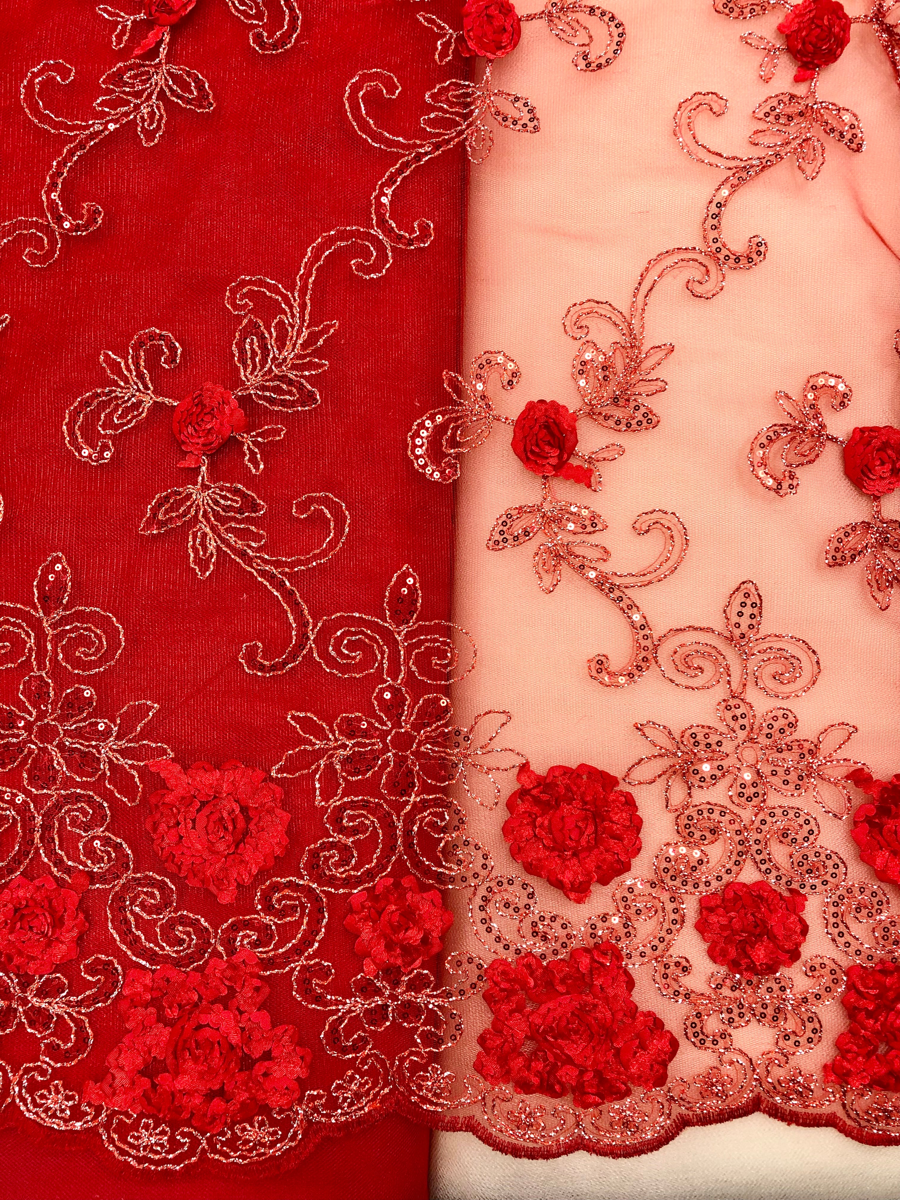 Priced per yard. Beautiful sequined red lace with metallic silver and 3D flowers. 52-inches wide. Very lightweight. Border on both edges.