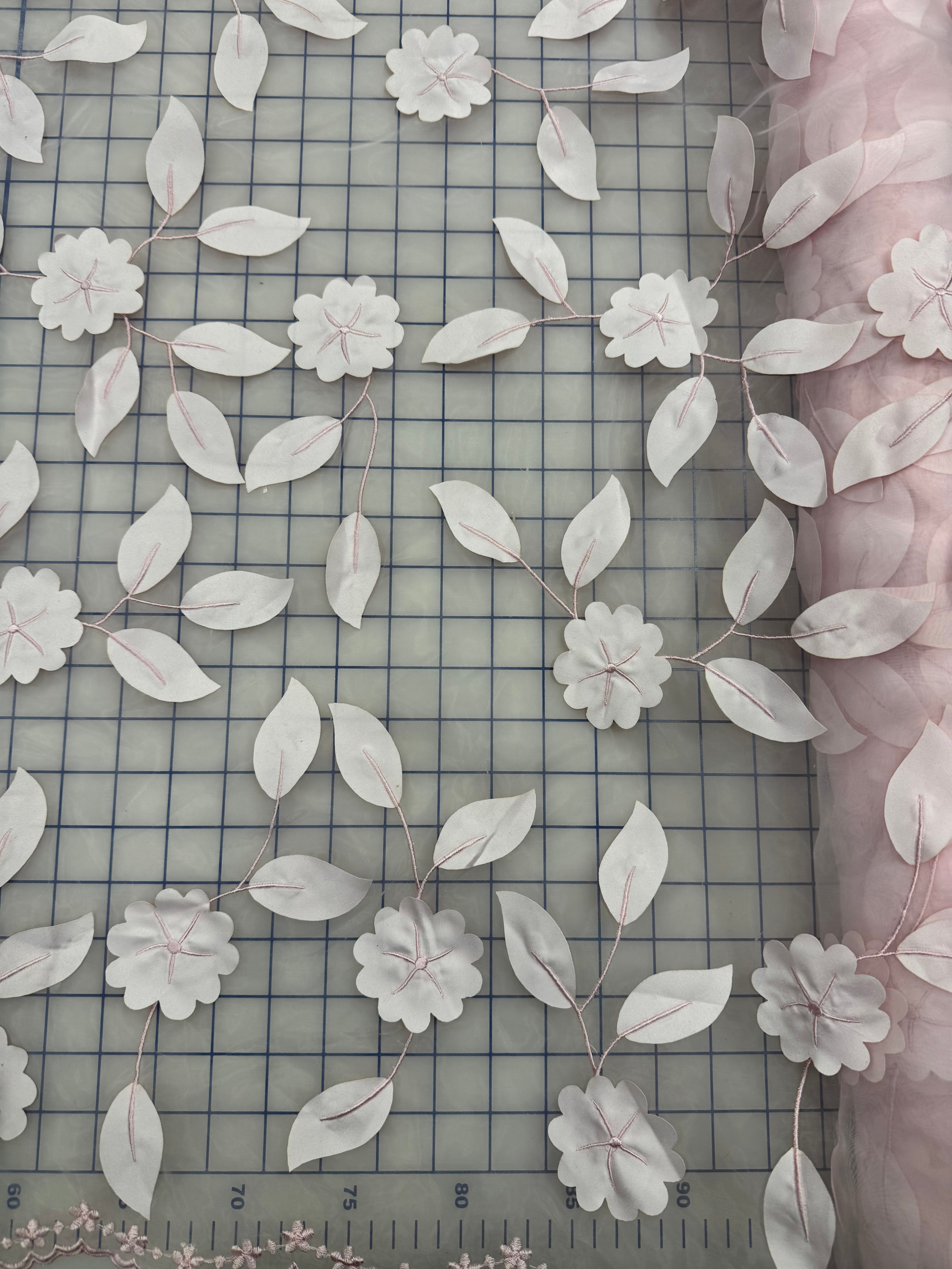 Priced per yard. Pink embroidered organza with 3D flower and leaf design. 50-inches wide. Beautiful. Perfect for many costumes - skirts, peasant blouses and aprons, etc.