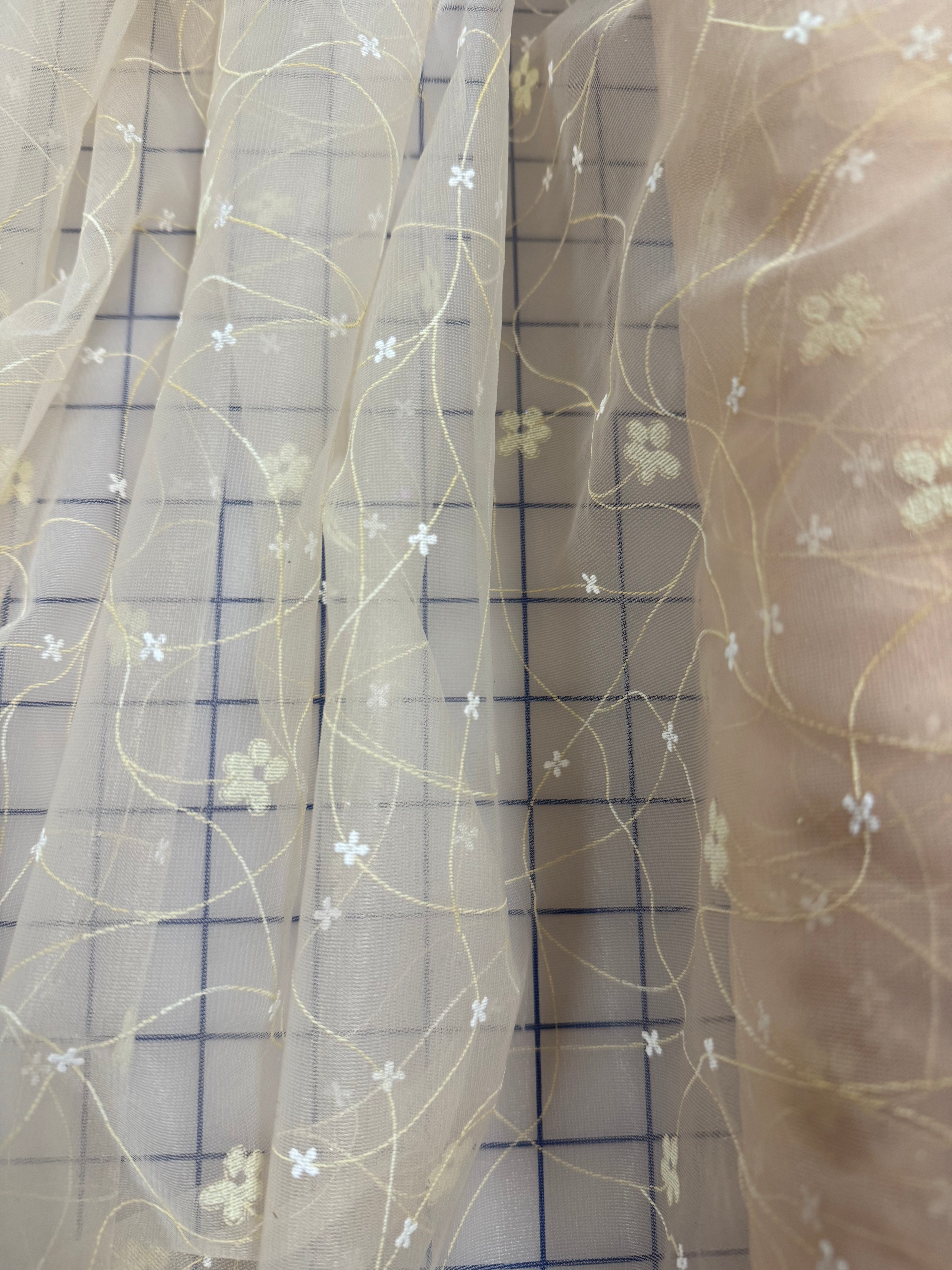 Priced per yard. Beige nylon sheer with a flower design. 60-inches wide. Beautiful. Perfect for many costumes - overlays for skirts, peasant blouses, sleeves, etc.