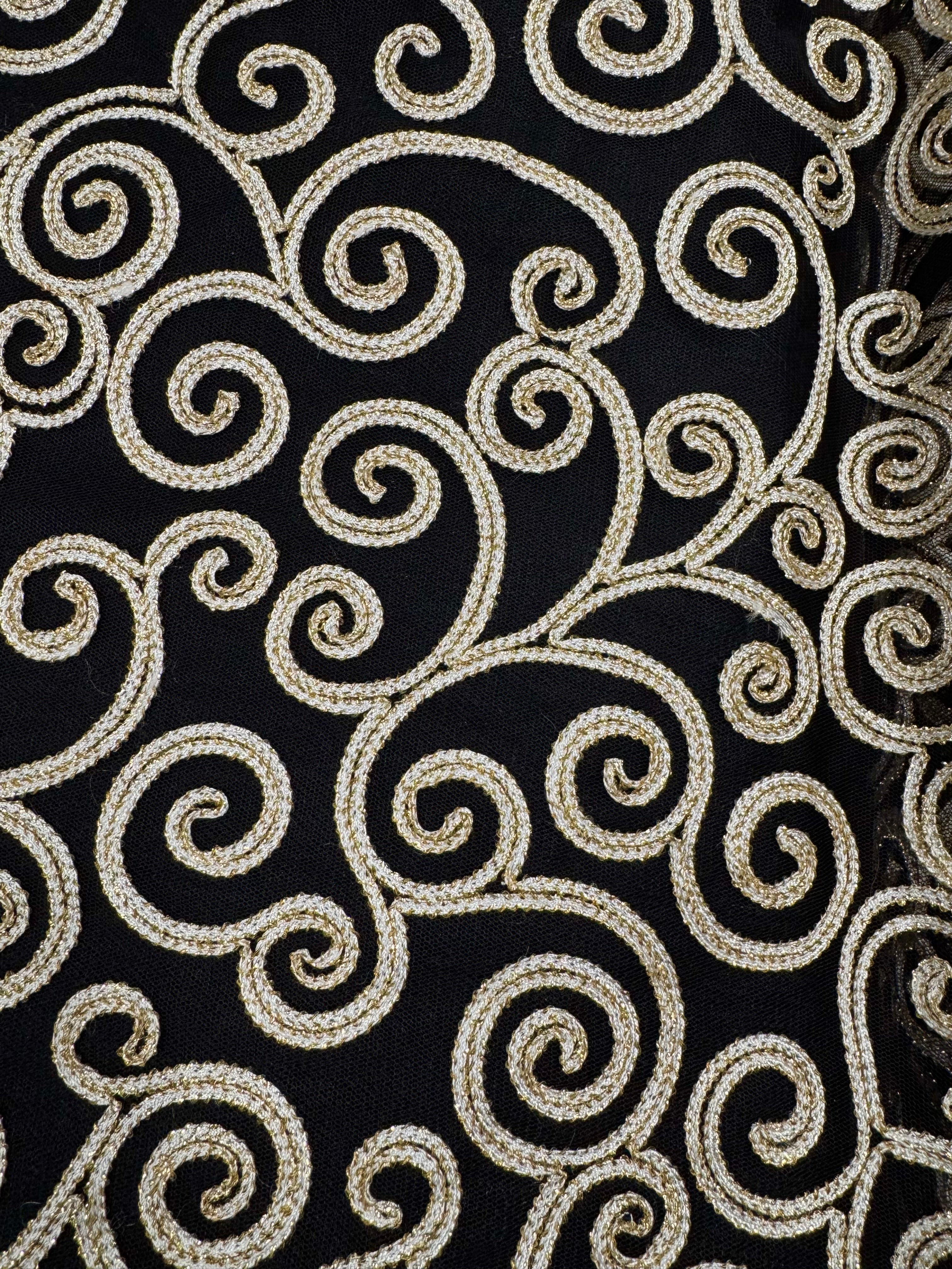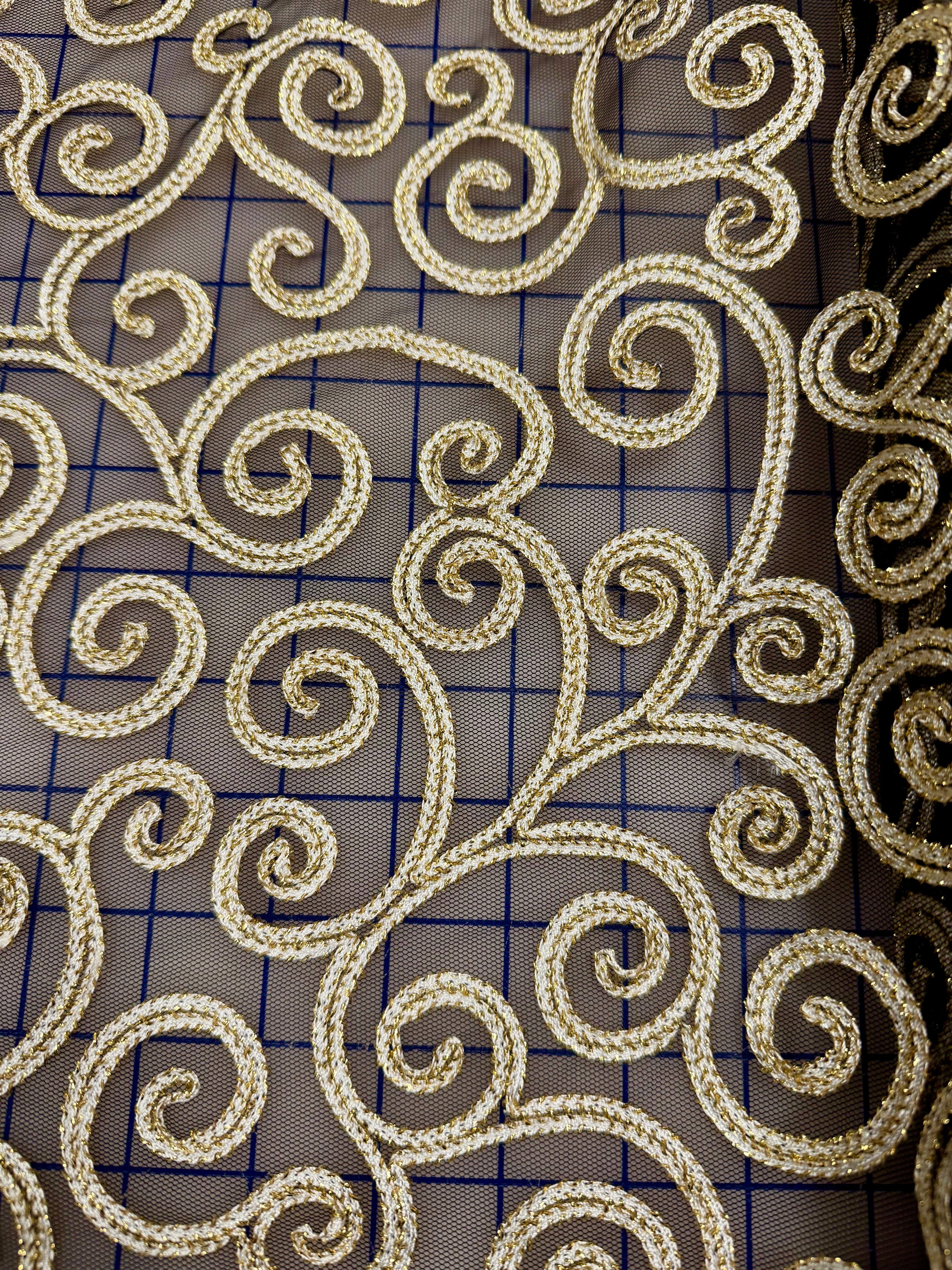Priced per yard. Gold and White Scroll on Black Tulle Mesh. 43-inches wide. Perfect for decorating tutus and other costumes.