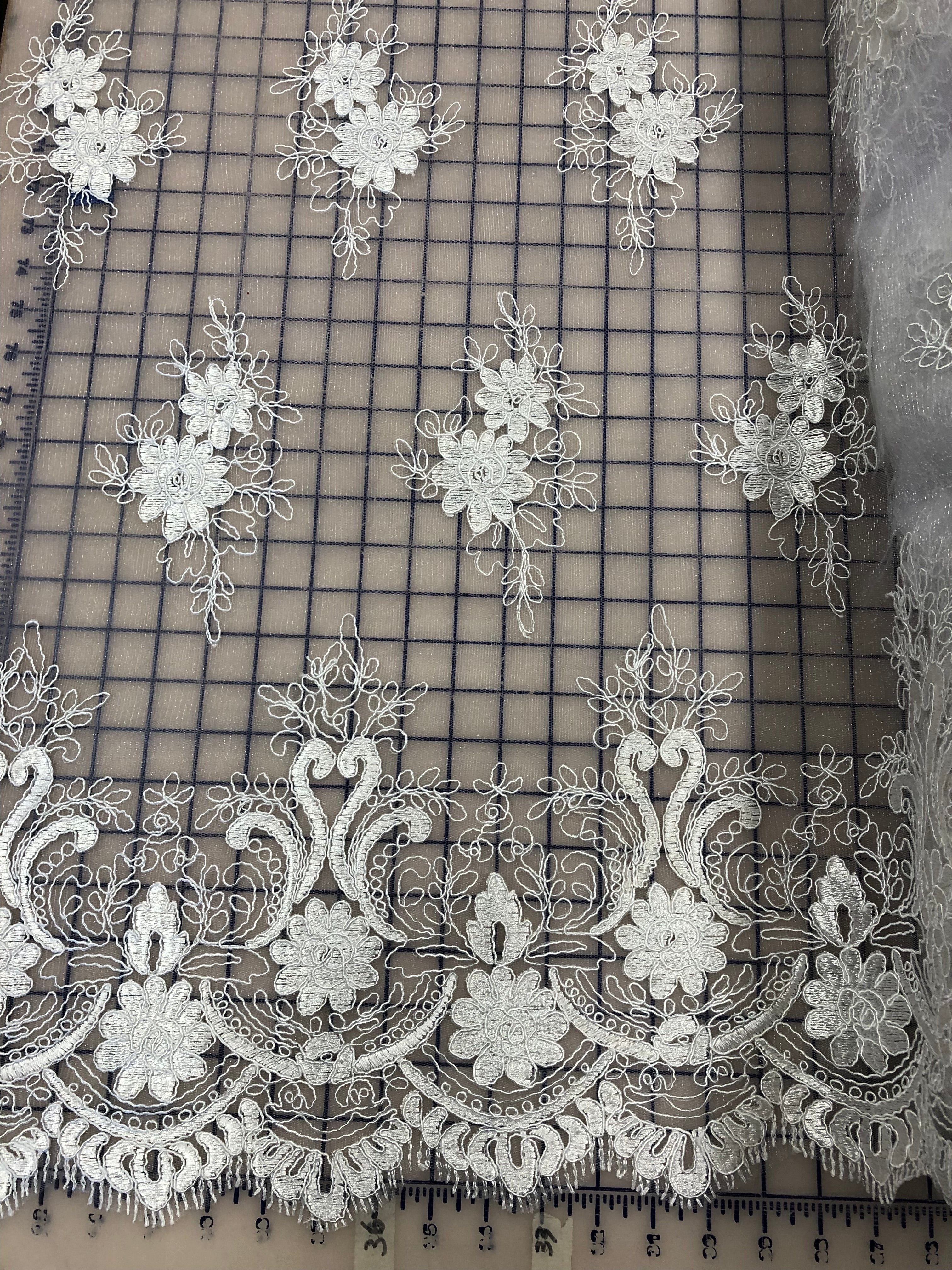 Priced per 1.75 yard piece. Beautiful, delicate white embroidered lace with many motifs per yard and a gorgeous border on both edges. 60-inches wide. Lightweight.