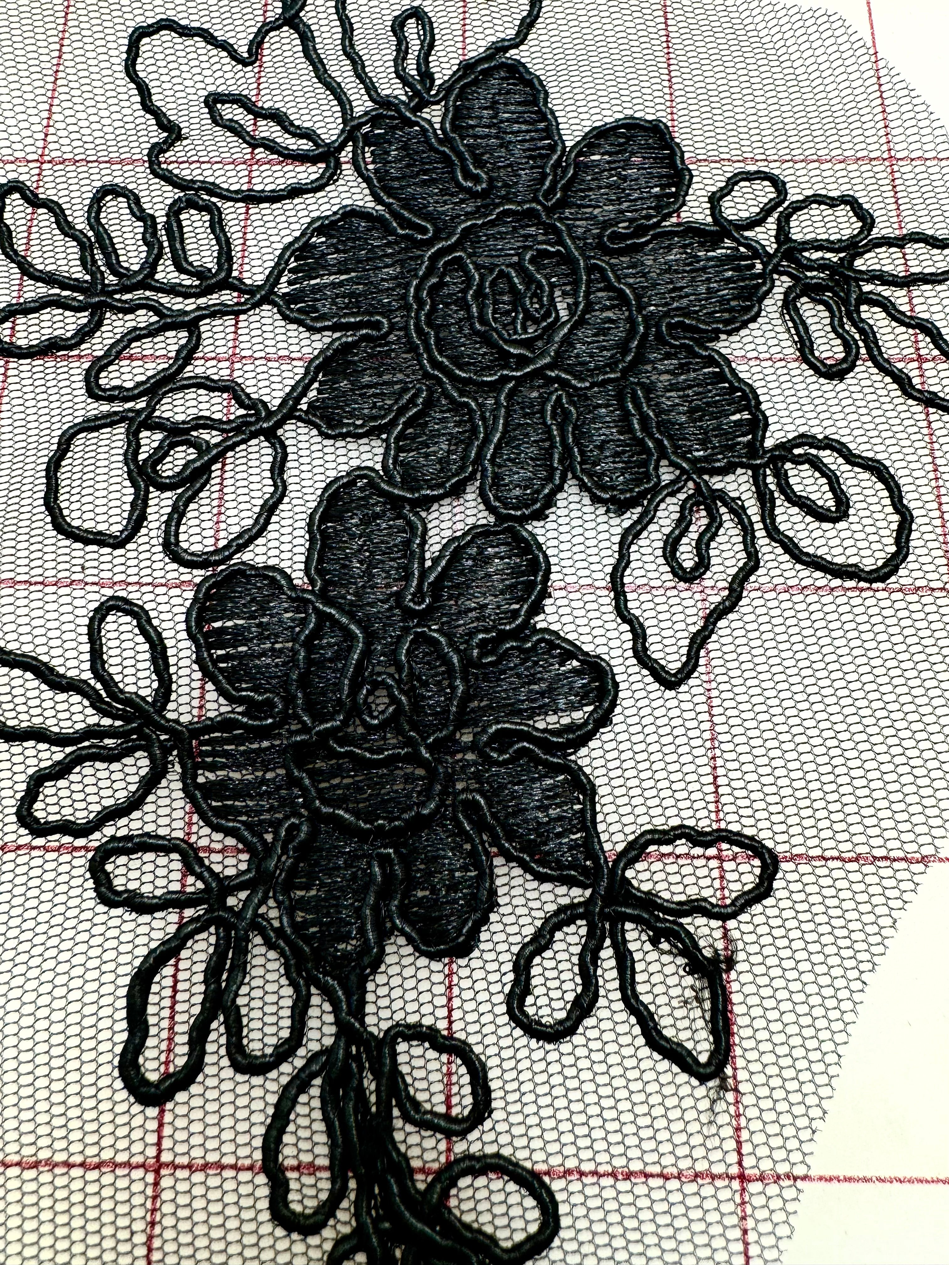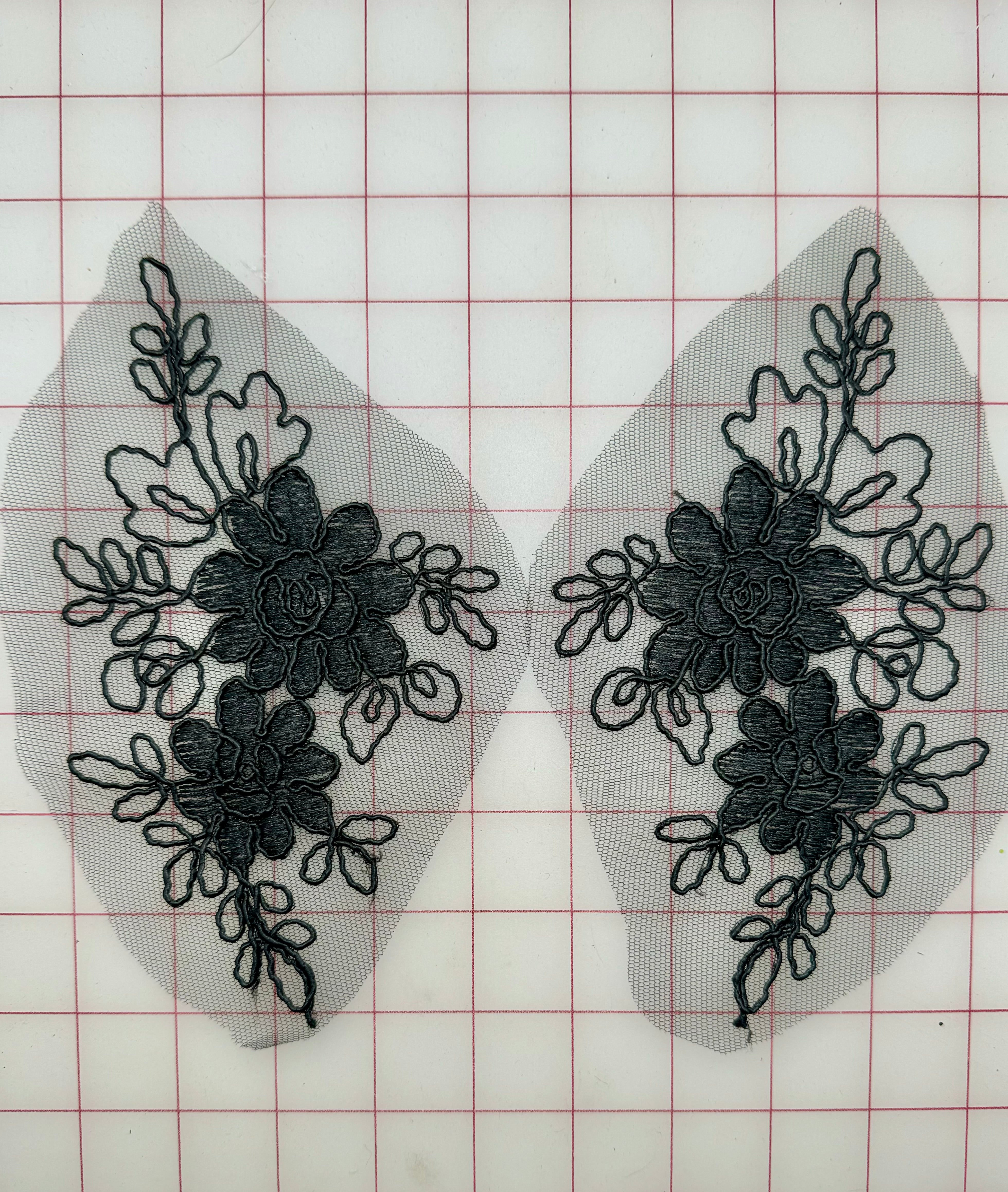 Priced per pair. Beautiful, delicate black embroidered lace motif pairs. Lightweight.