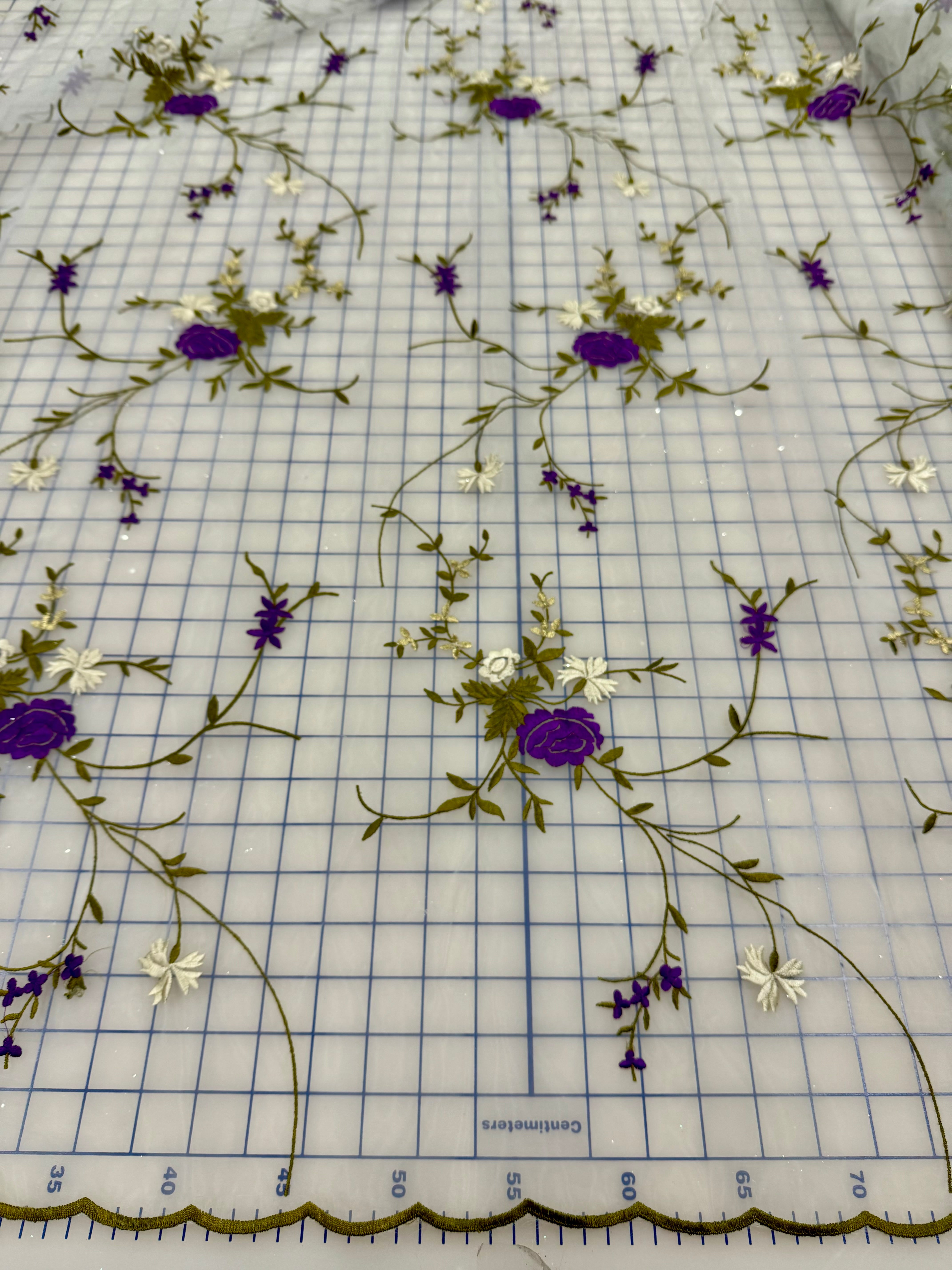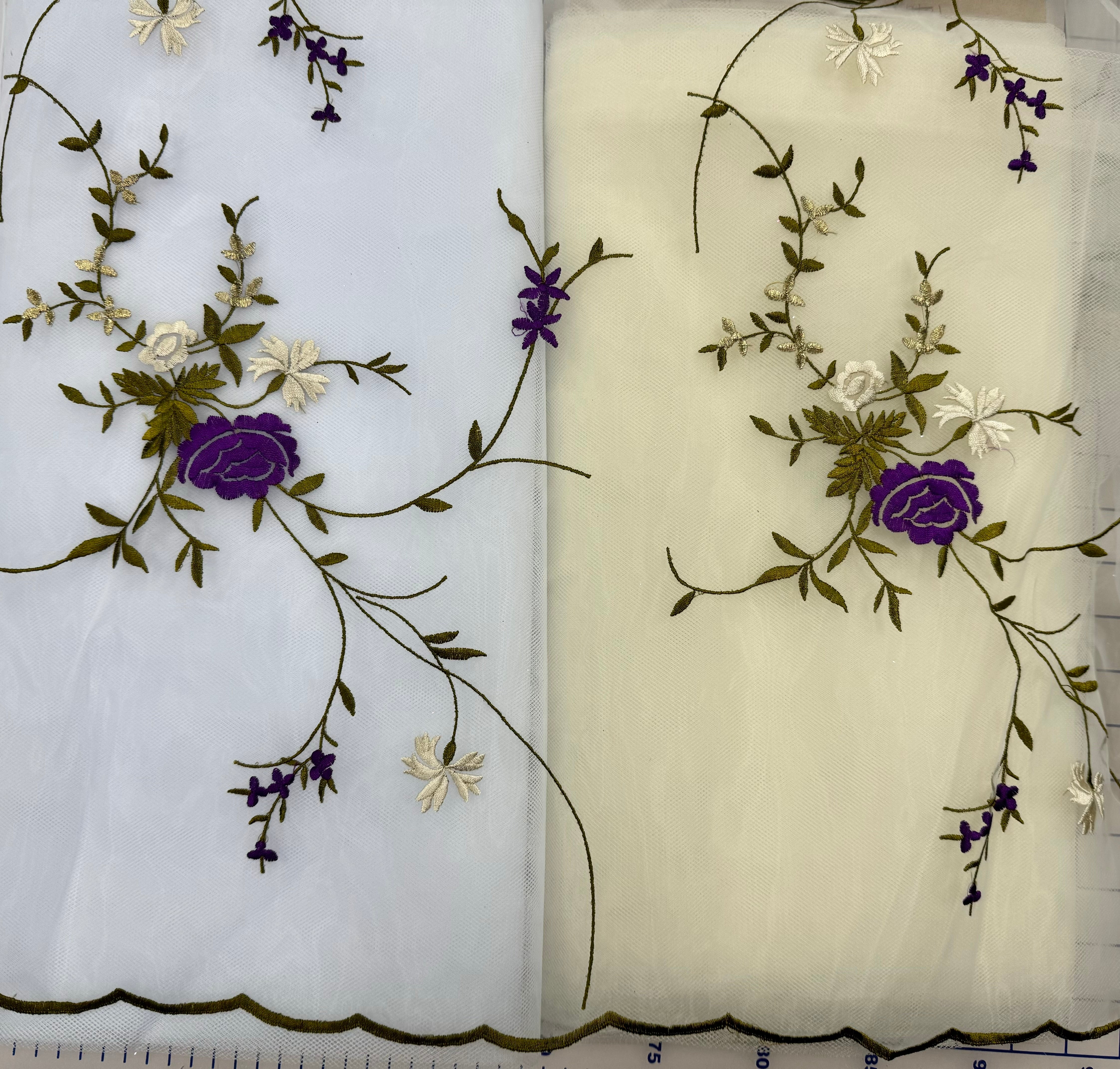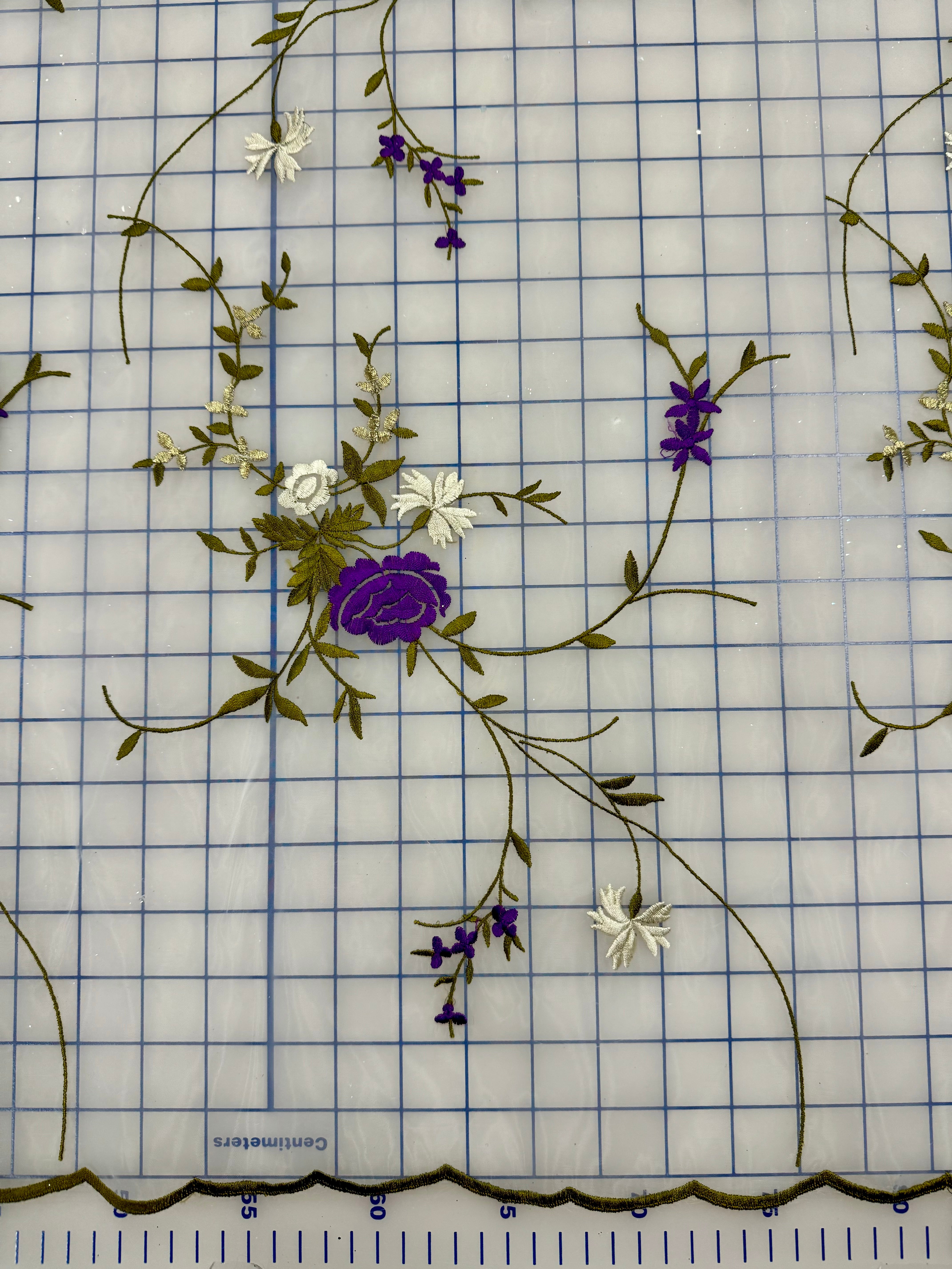 Priced per yard. Plum purple embroidery on white organza. Scalloped border on both selvages. 52-inches wide.