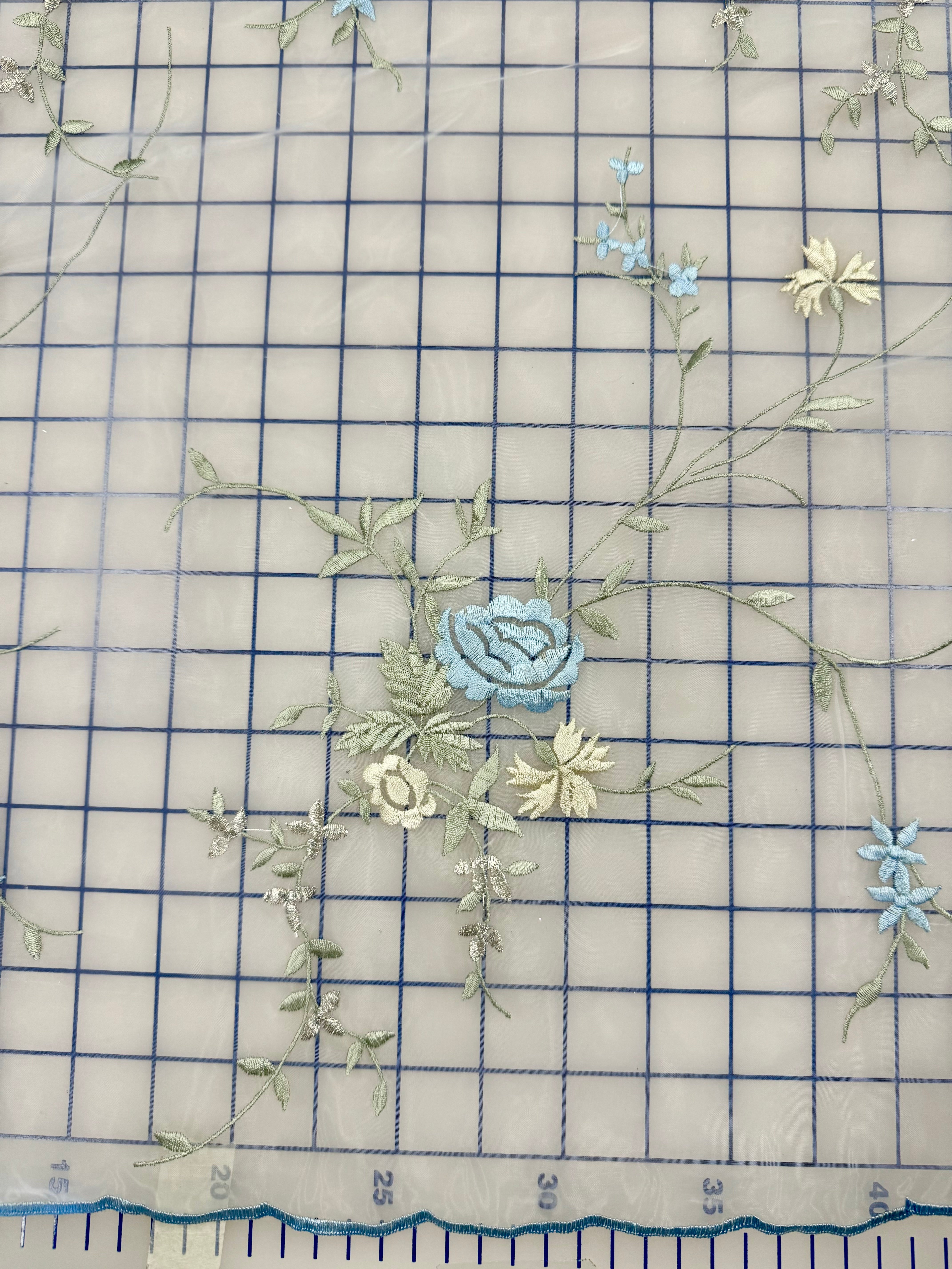 Priced per yard. Light Blue embroidery on white organza. Scalloped border on both selvages. 52-inches wide.