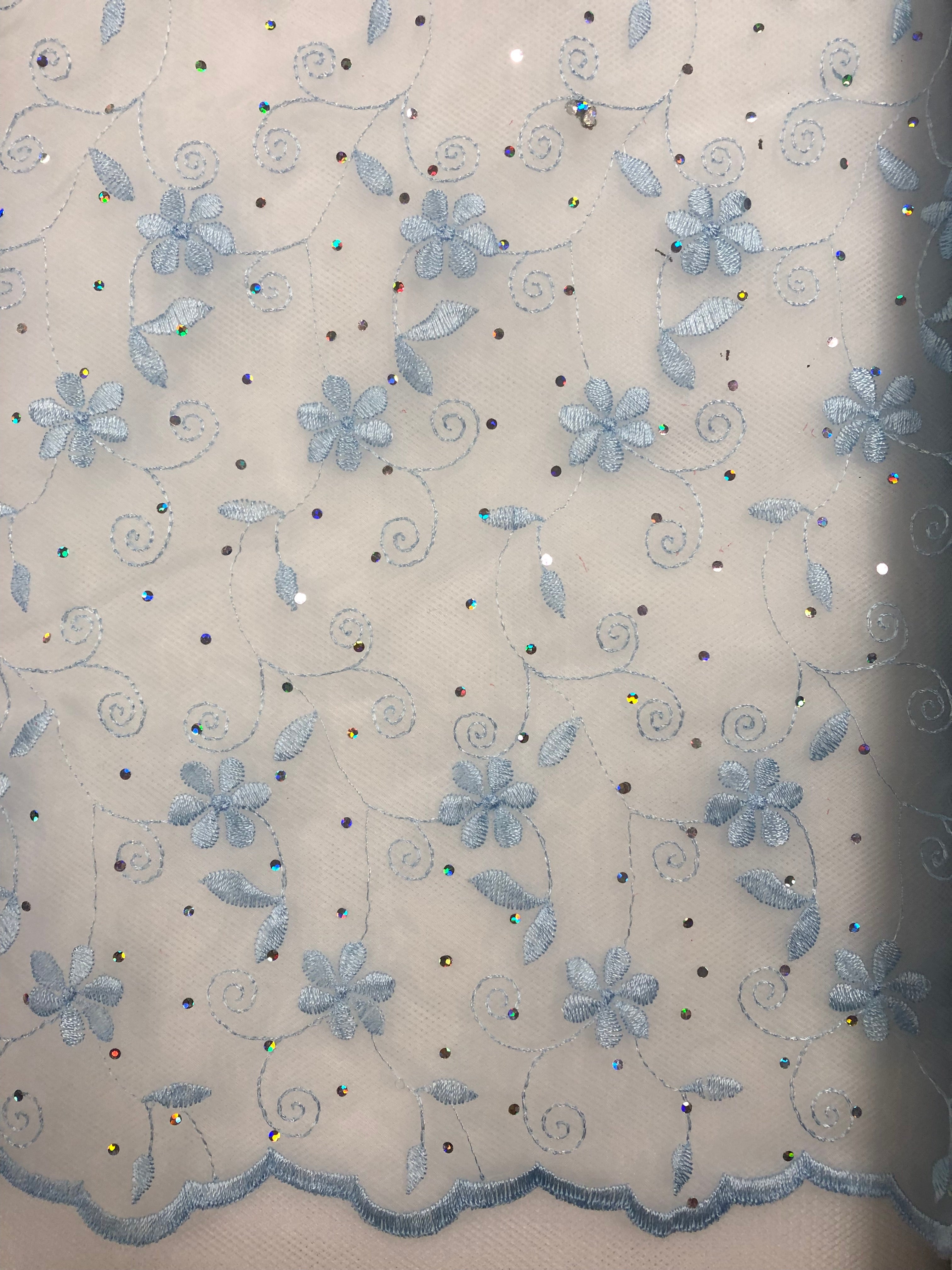 Priced per yard. Light Blue embroidered organza with iridescent dots. Small Scalloped border on both selvages. 52-inches wide.