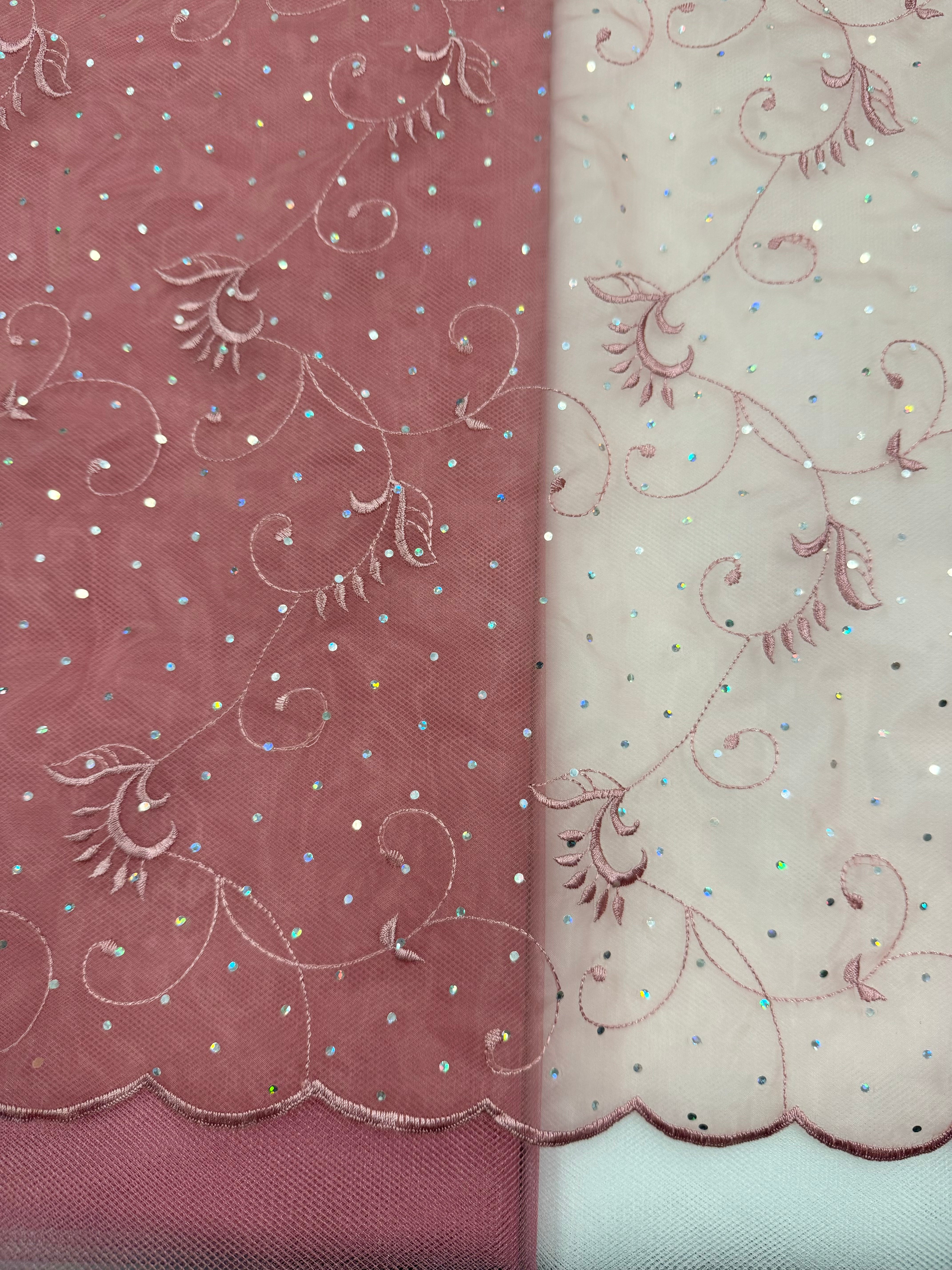Priced per yard. Dusty Rose embroidery on organza with iridescent sparkles. 53-inches wide.