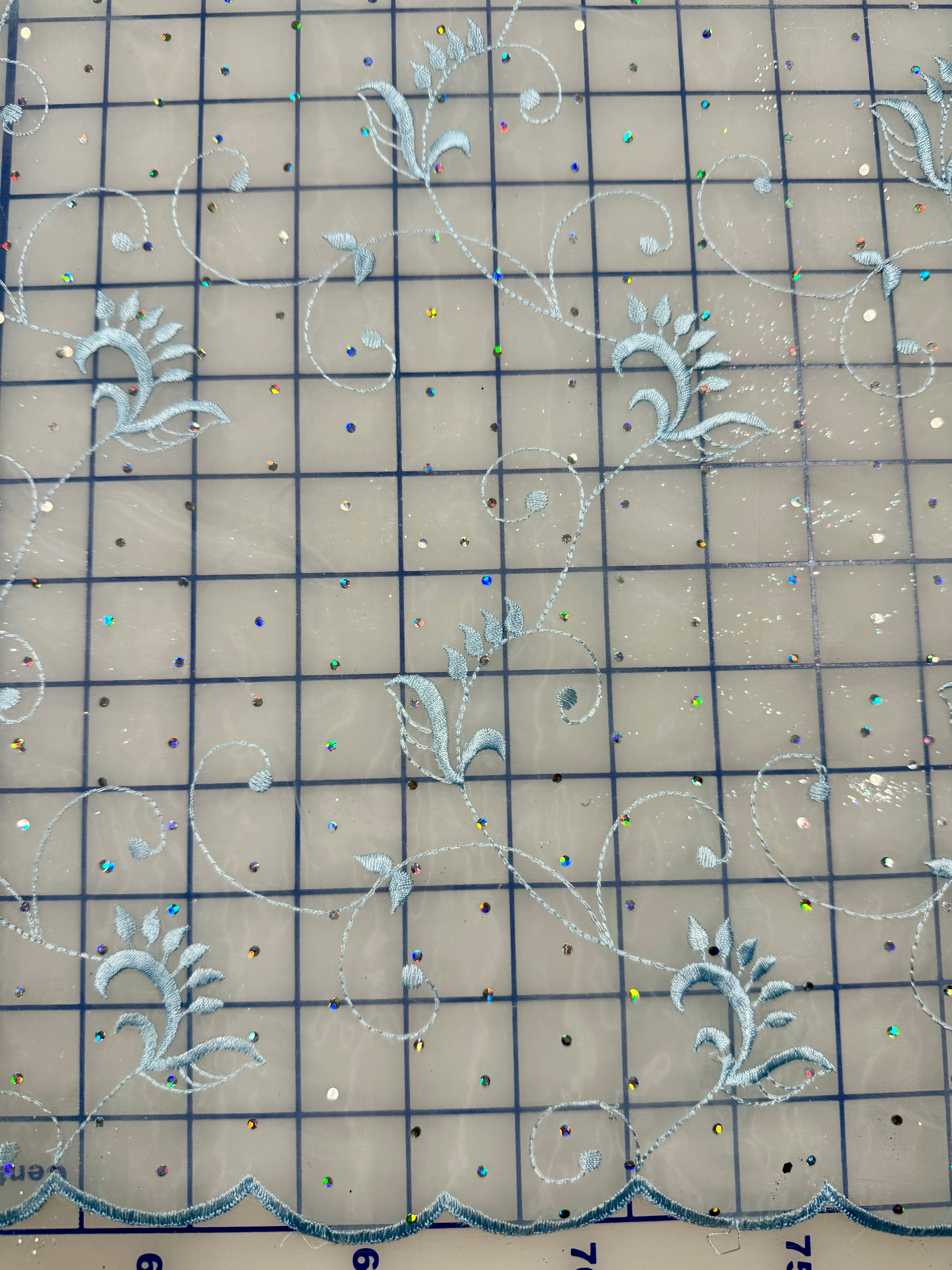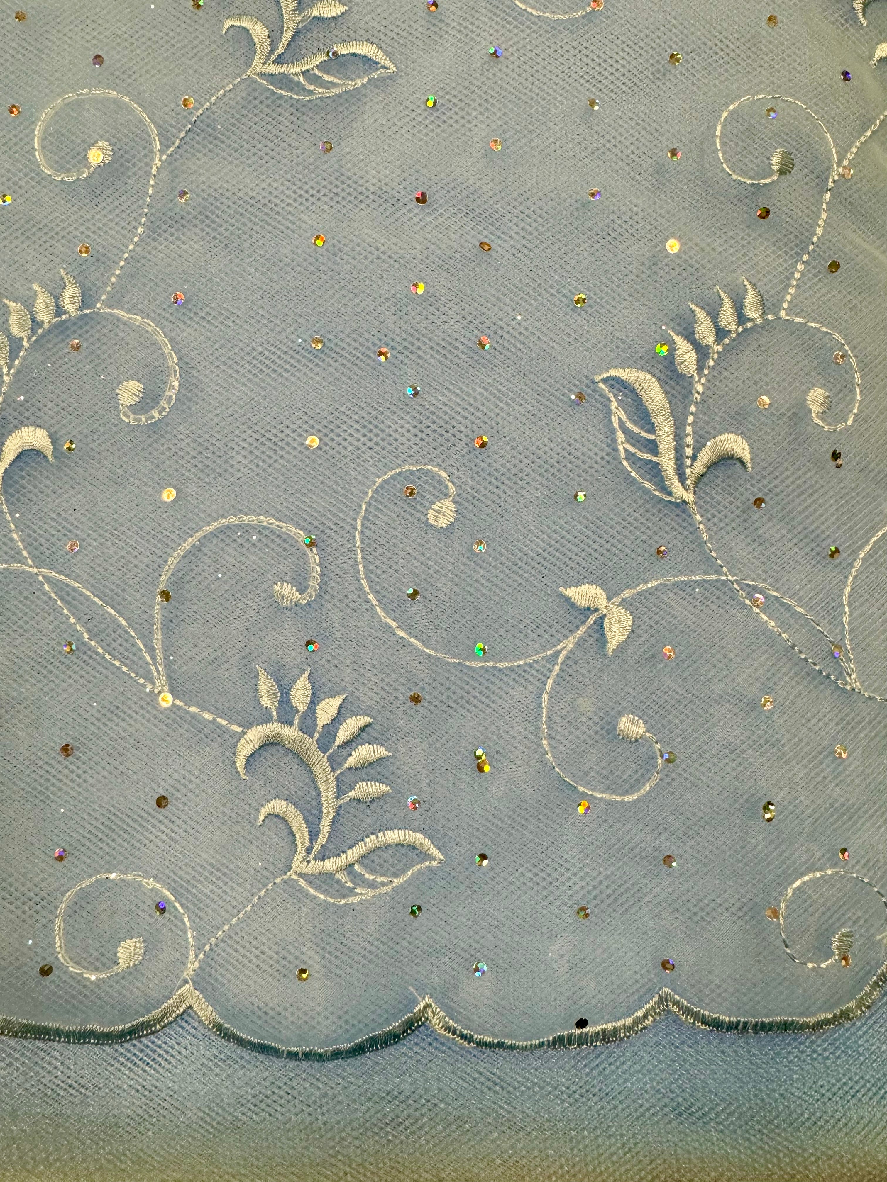 Priced per yard. Light Blue embroidered organza with iridescent sparkle dots. Small Scalloped border on both selvages. 54-inches wide.