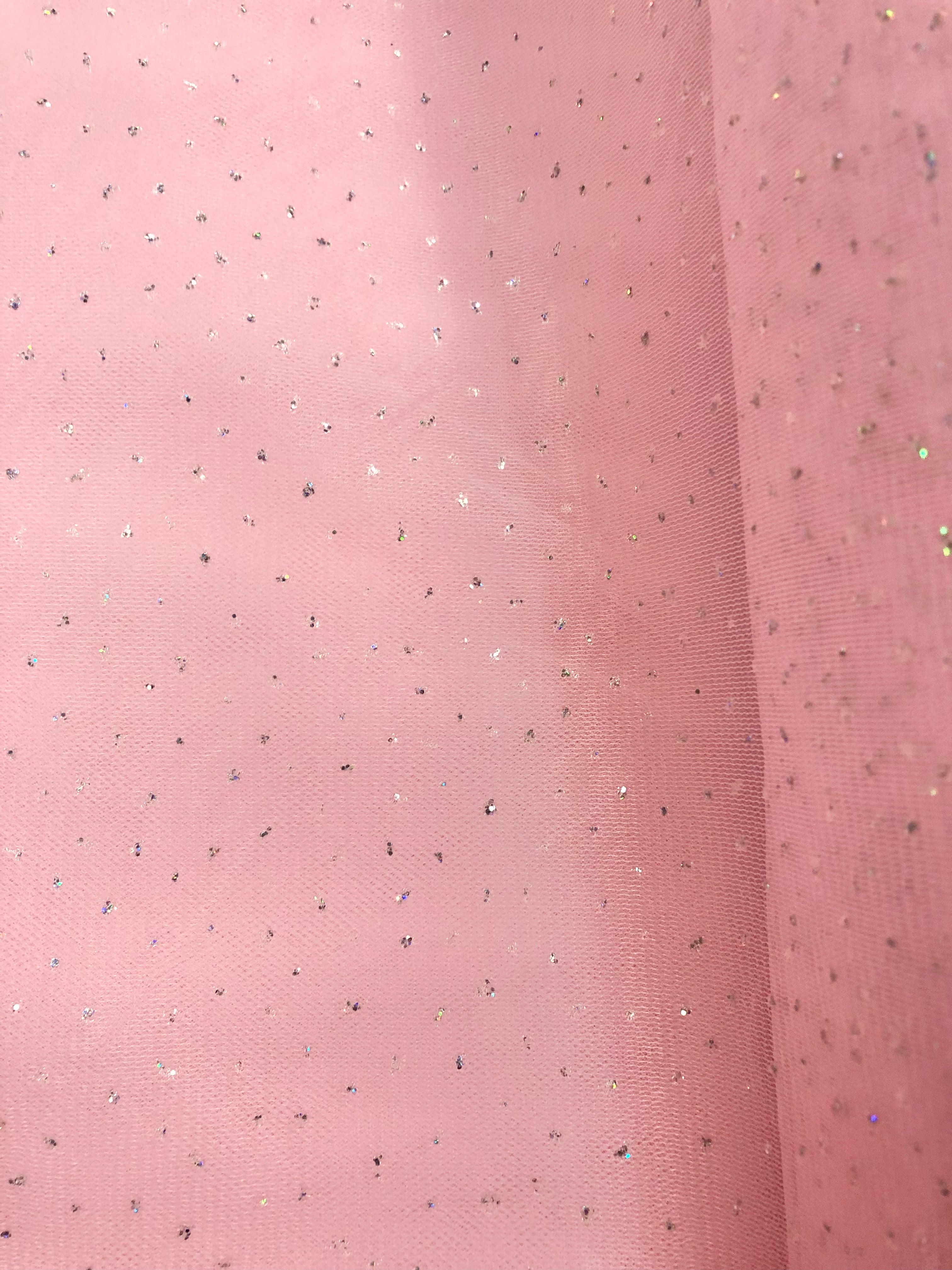 Priced per yard. Light Pink with iridescent silver micro-dots of sparkle on nylon organza.