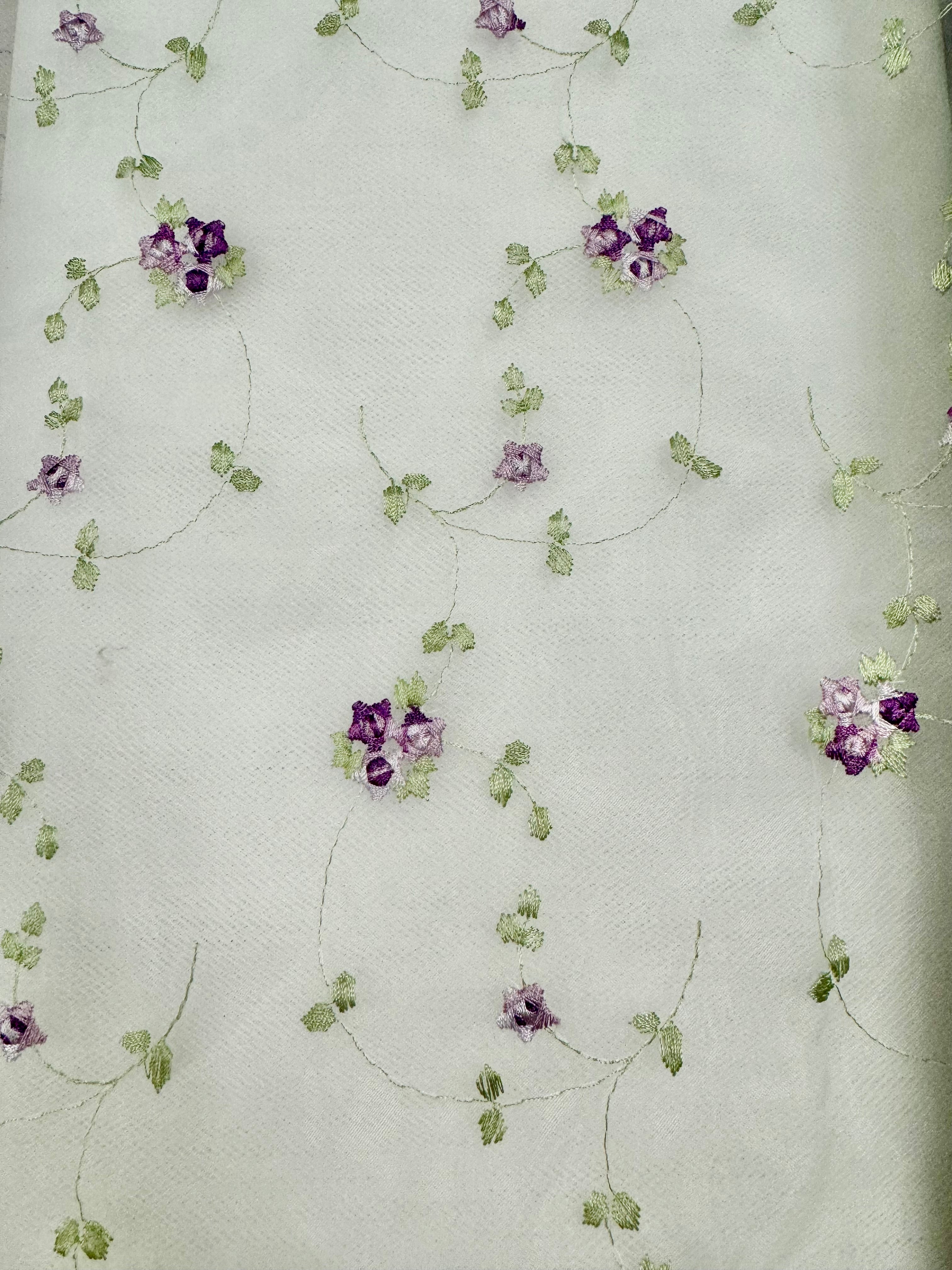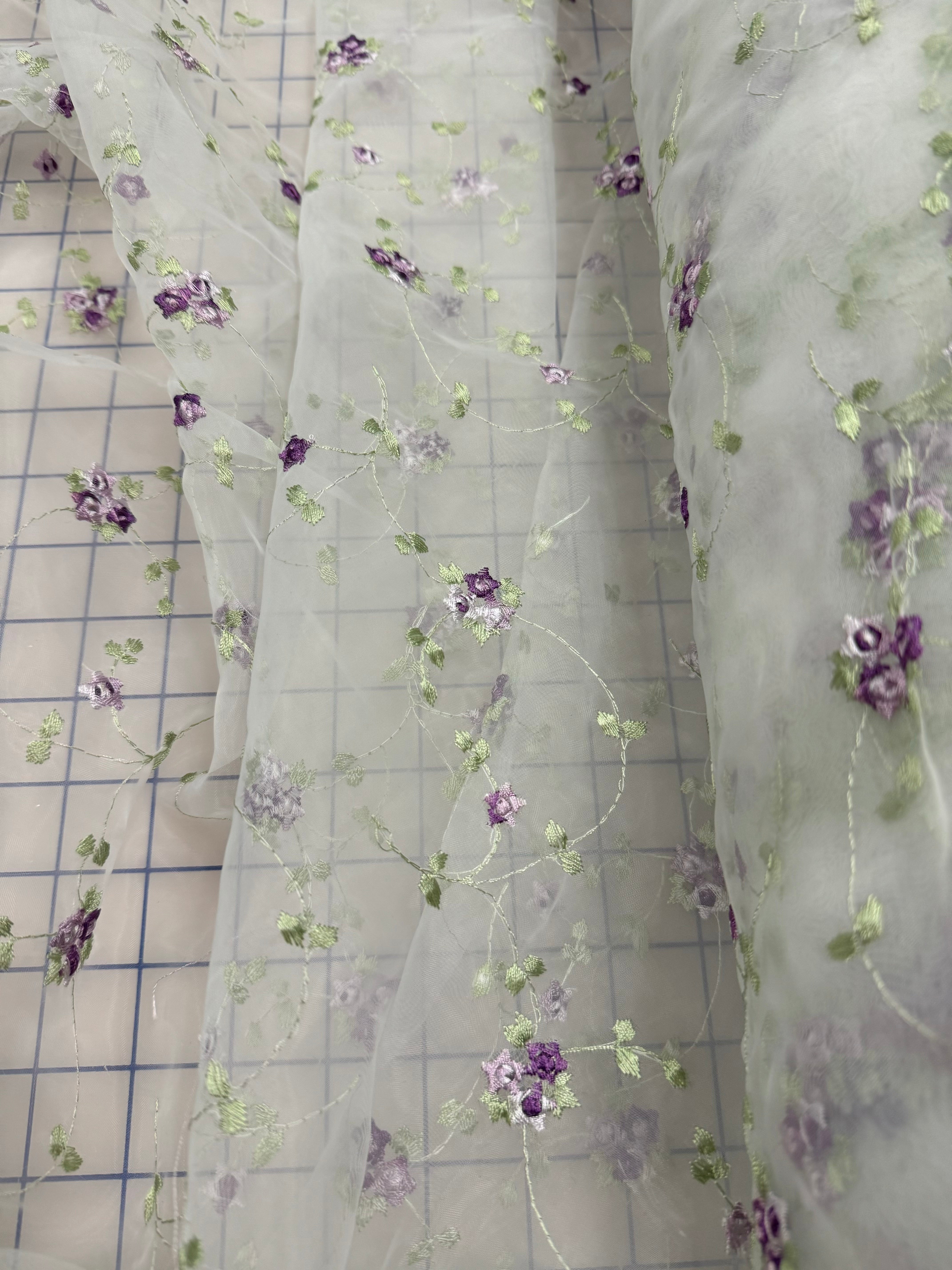 Priced per yard. White organza with purple all-over embroidered flower motif design.