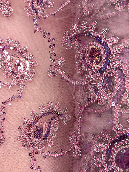 Priced per yard. Fancy sequined paisley lace also referred to as "Fancy African Lace." Pink and Silver. 50-inches wide. Lightweight. Perfect for costume embellishment.