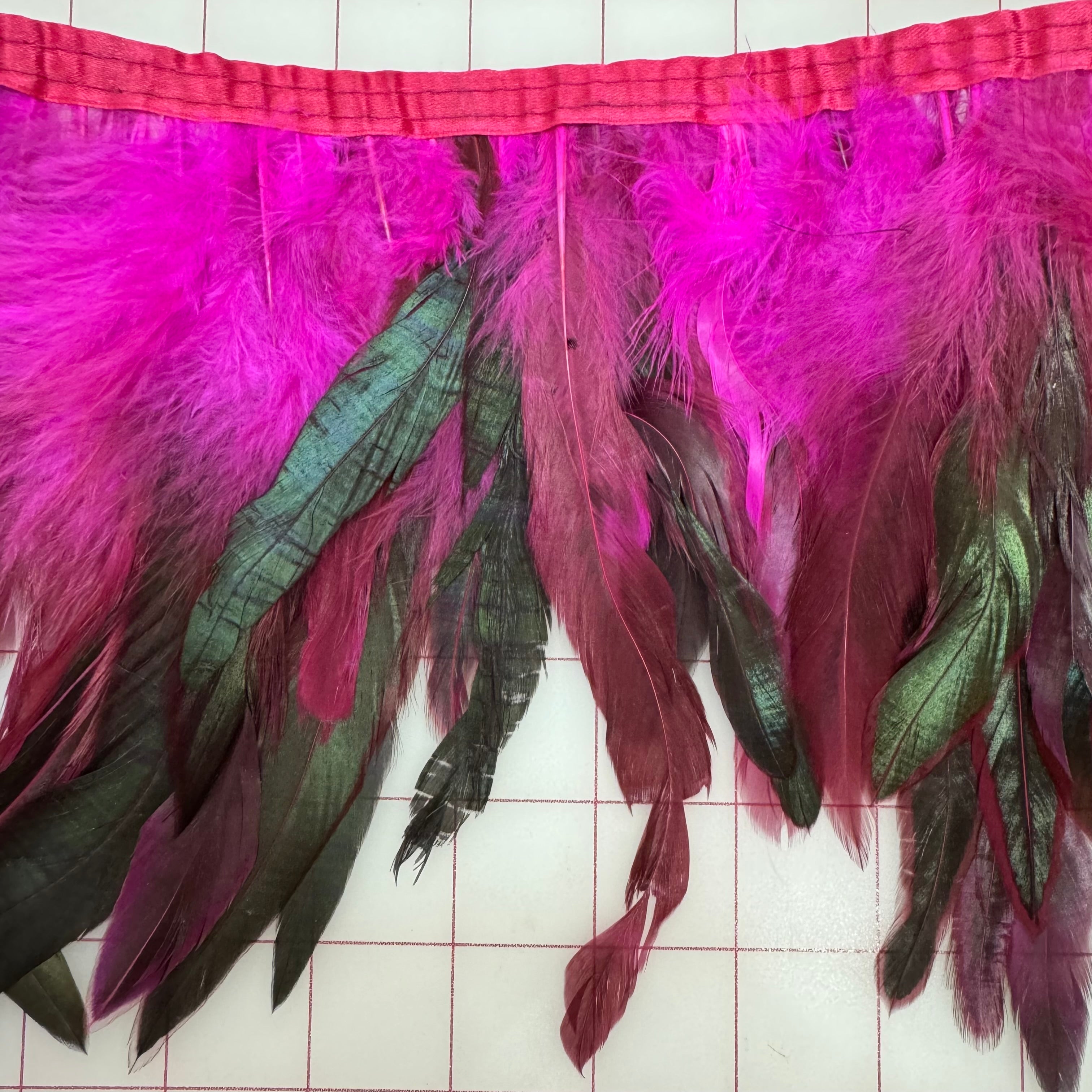 Priced per yard. Fuchsia dyed Chinchilla Rooster Schlappen feathers. Gorgeous! Feathers are 4 to 6 inches long. Feathers can be used by the yard or individually.