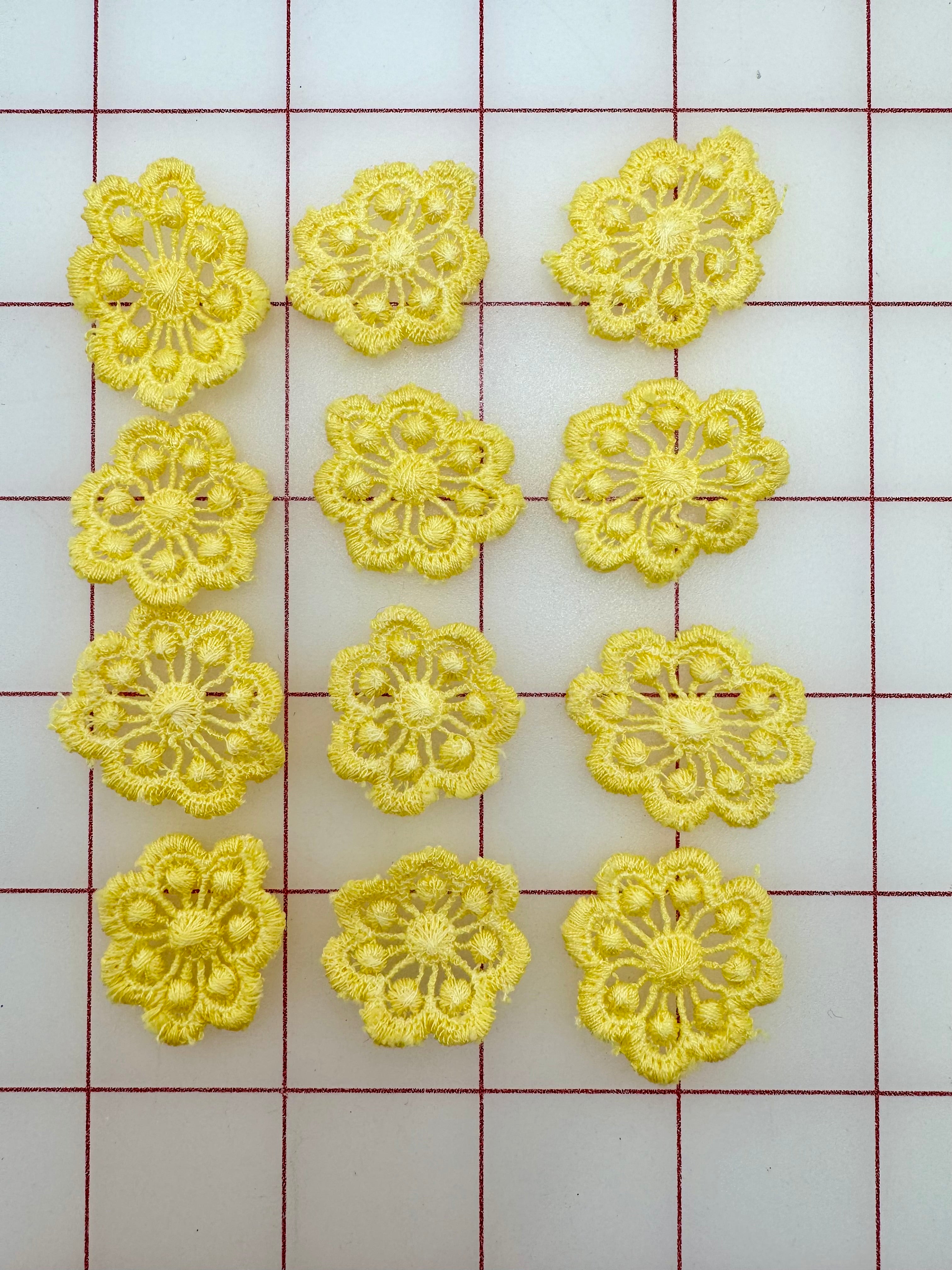 Priced per dozen. Beautiful yellow flower appliques make the perfect accent for tutu plates, peasant dresses, firy costumes, headpieces, etc.