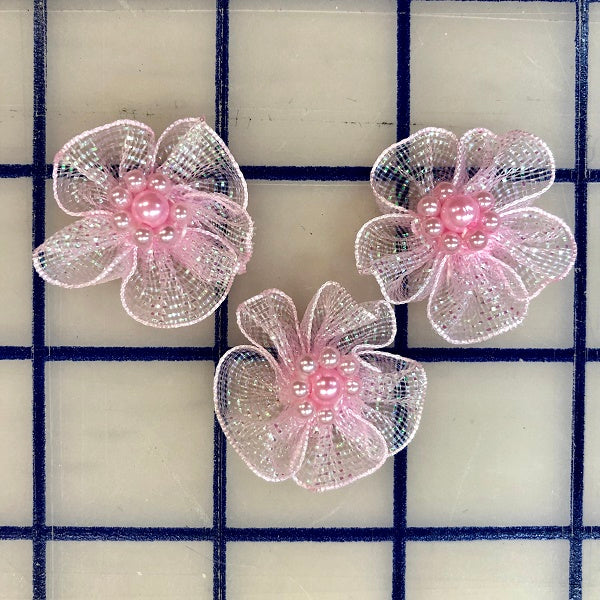 Priced per 3-pack. Pink iridescent flowers. Perfect accent for headpieces and costume embellishment. Size: one-inch.