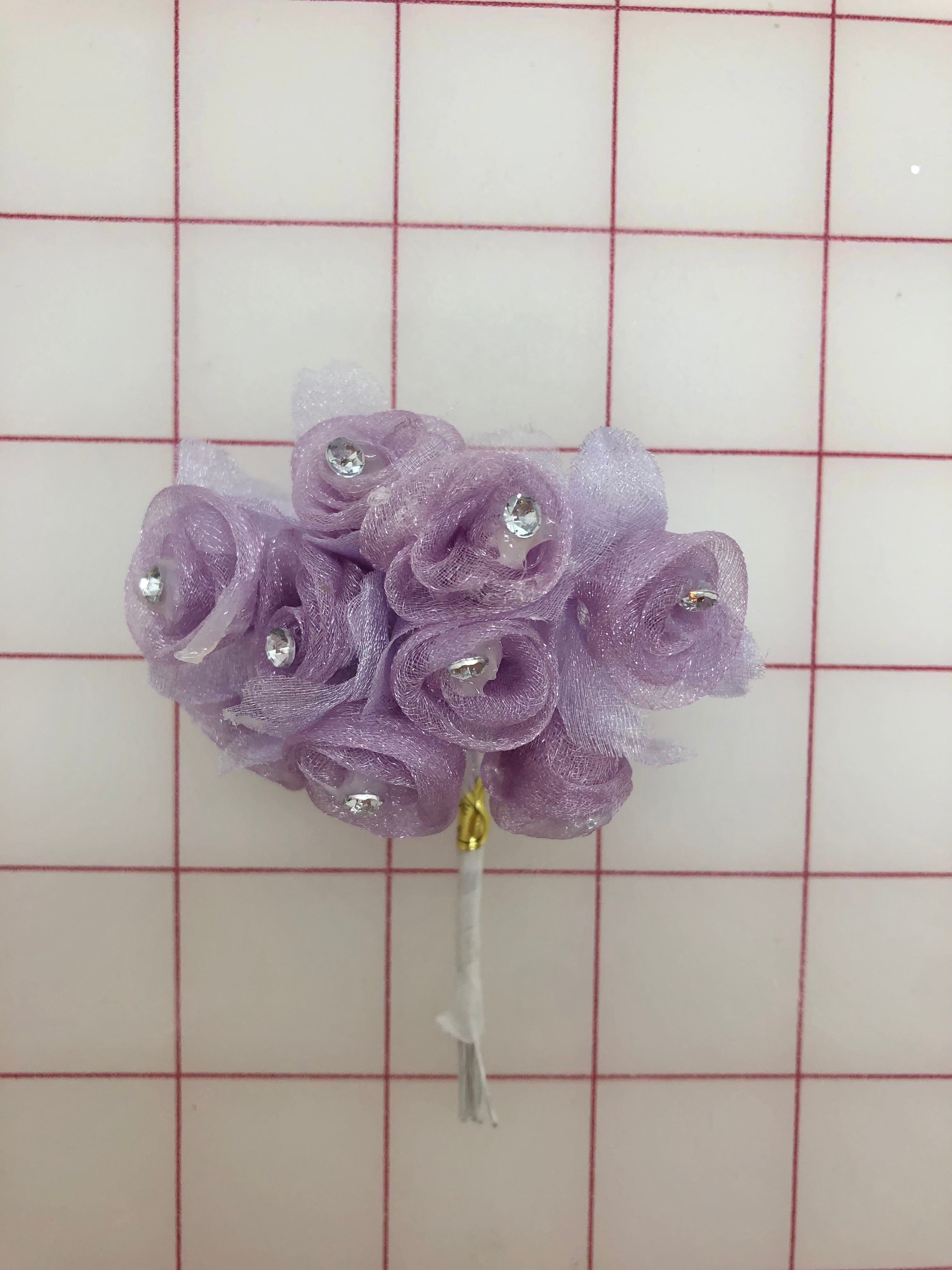 Priced per 9-flower bundle. Lavender sparkle organza buds, with a crystal rhinestone in the center of each.