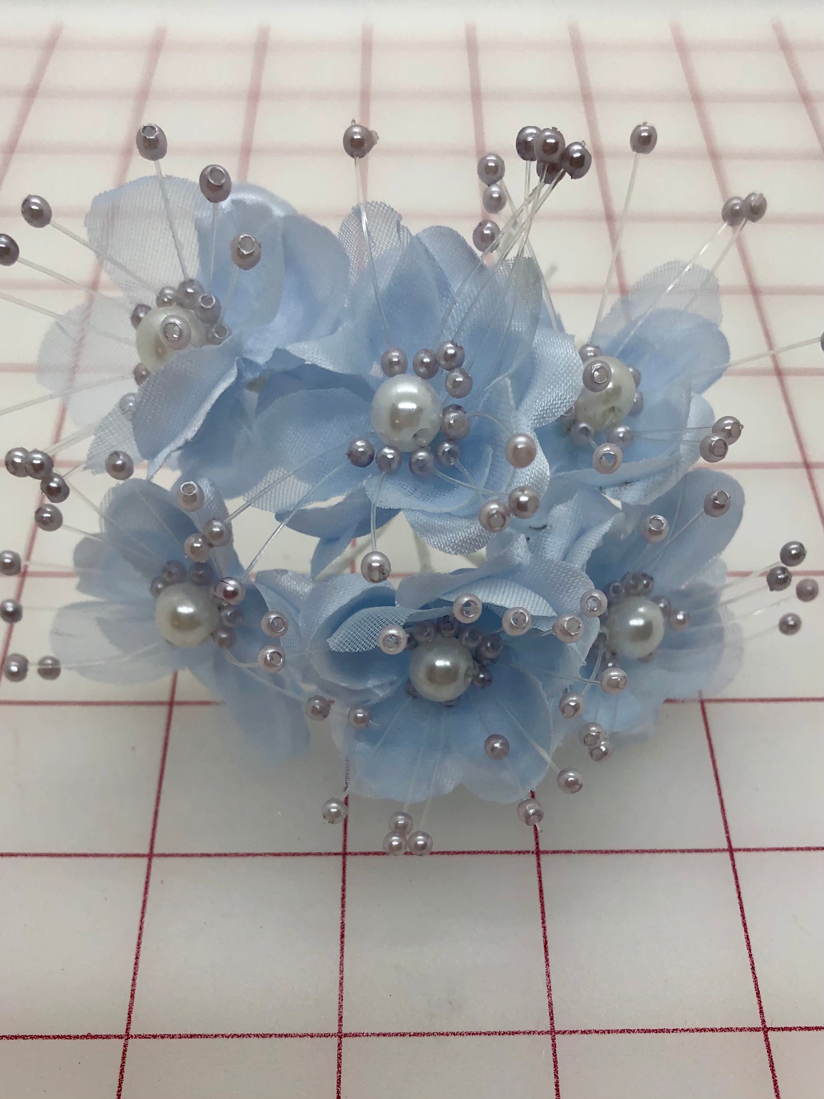 Priced per 6-flower bunch. Light Blue flowers with little pearls. Perfect for quick headpieces and embellishment. 10% discount per dozen 6-flower packs.