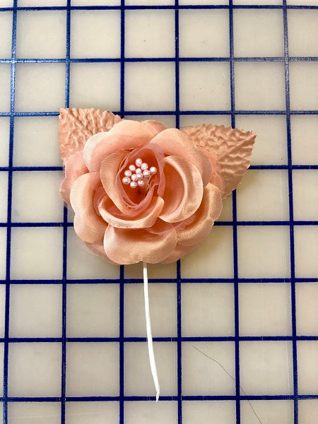 Priced per flower. Medium-size, peach satin/organdy roses. 10% discount per dozen of same color. Smallest quantity sold: one.