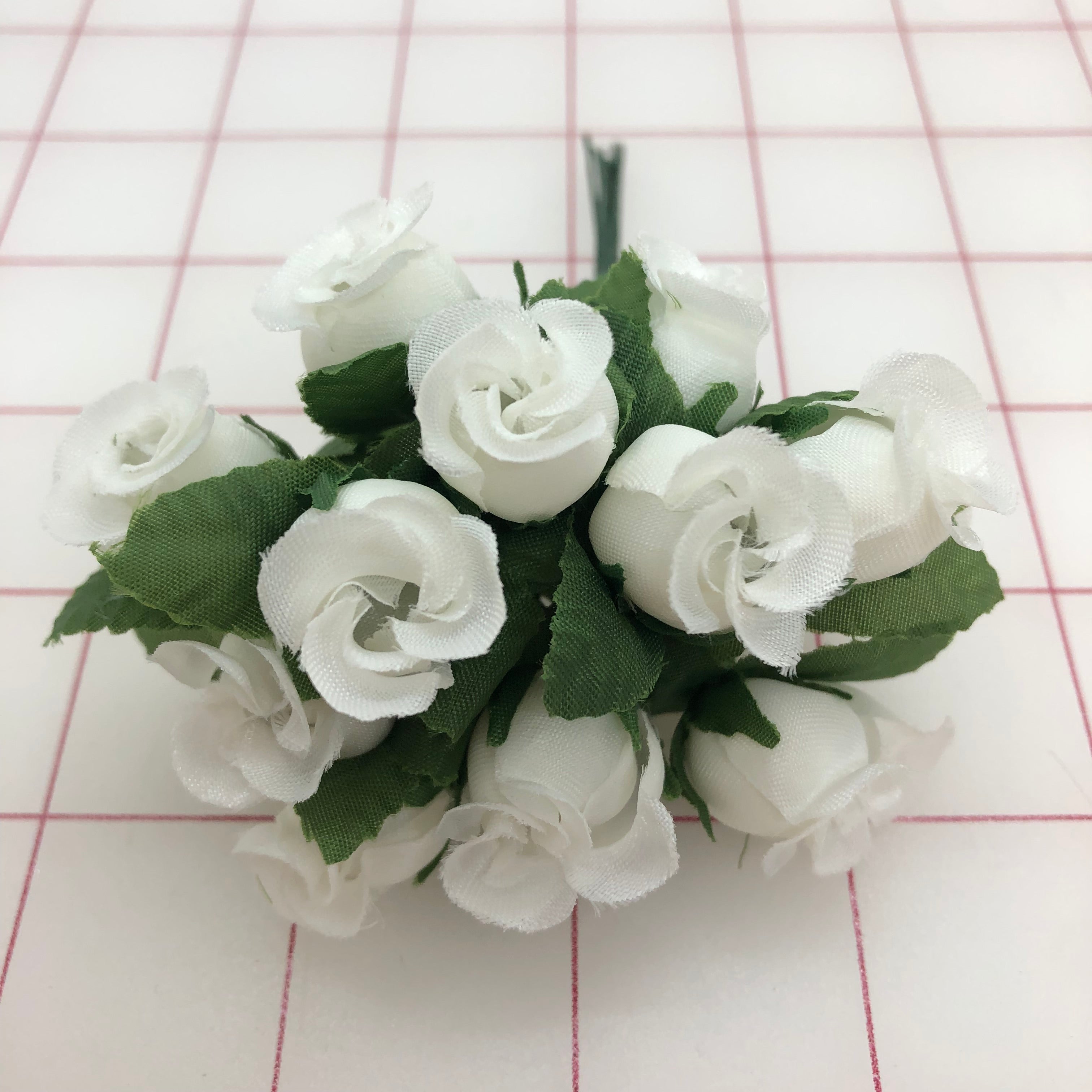 Priced per 12-flower bunch. White mini rosebuds with green leaves on individual green wires.