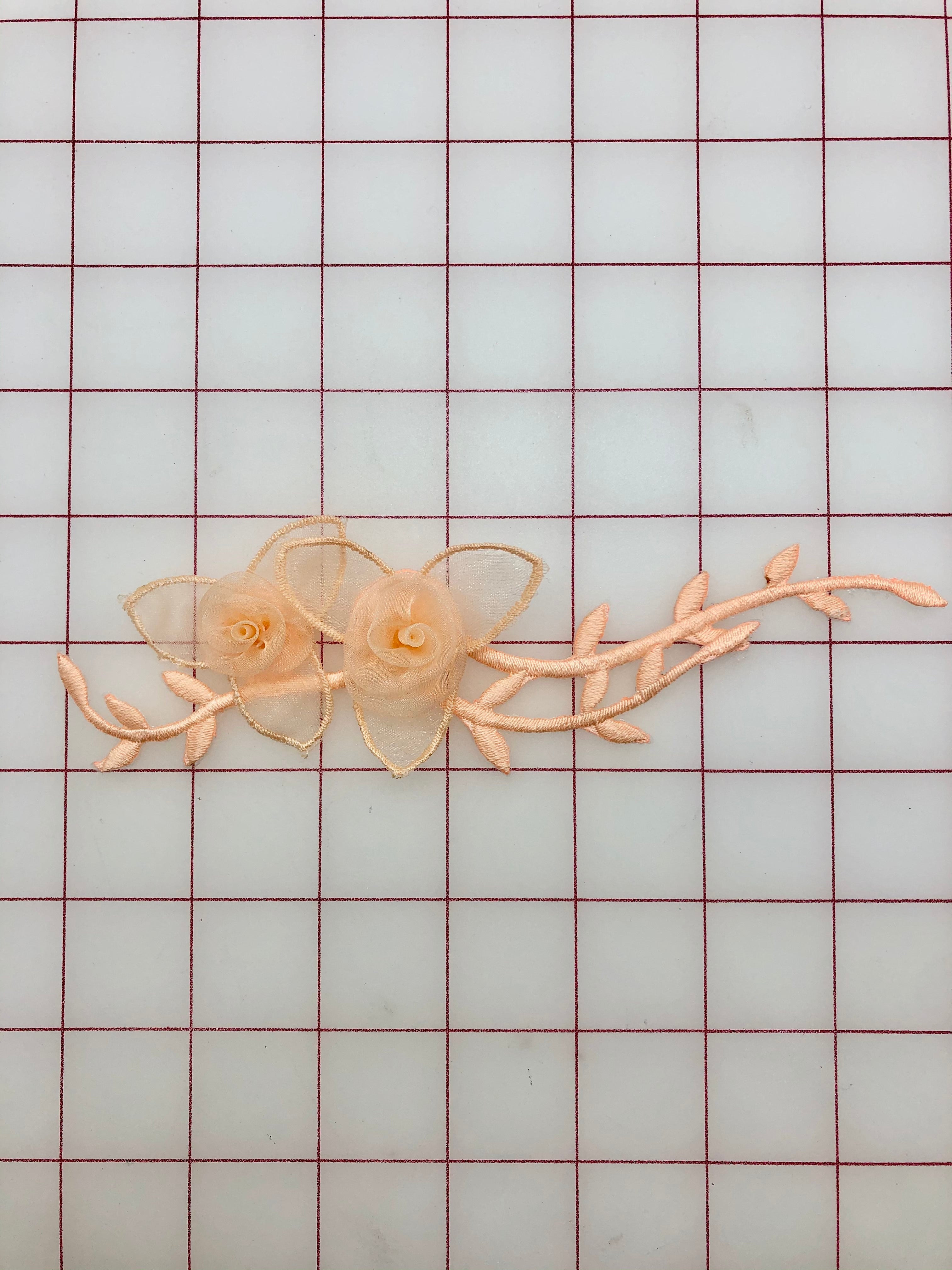 Priced per flower. 7-inch peach organza flower, with vine. Iron-on.