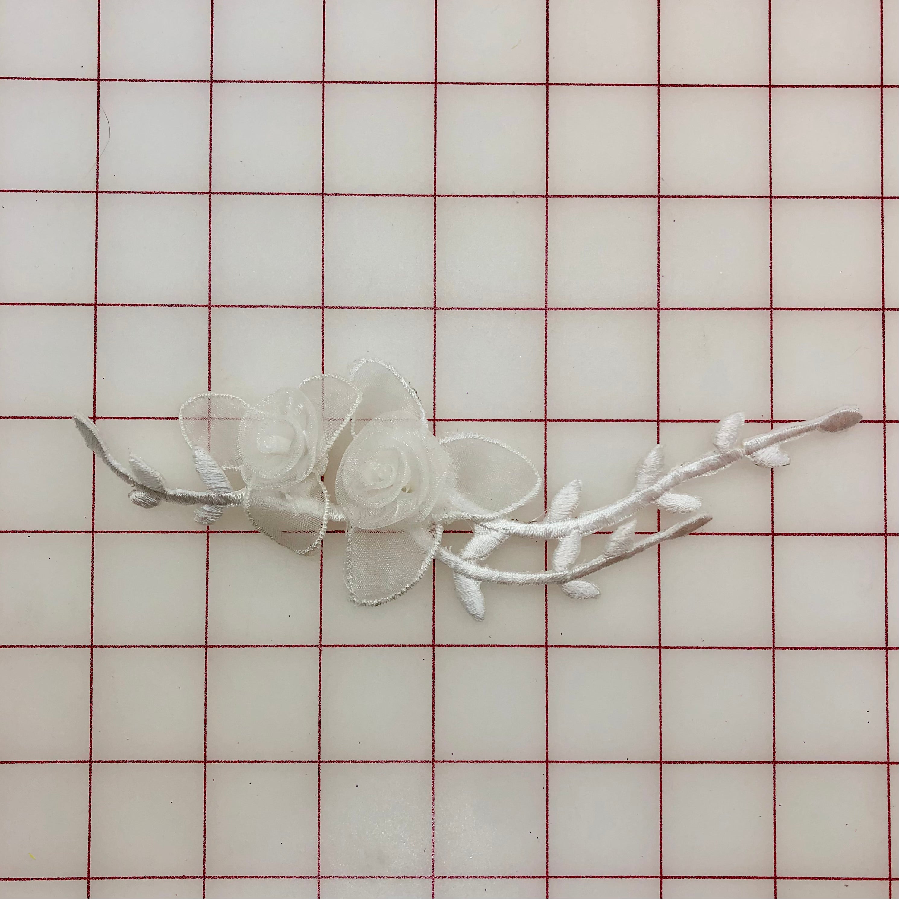 Priced per flower. 7-inch white organza flower, with vine. Iron-on.