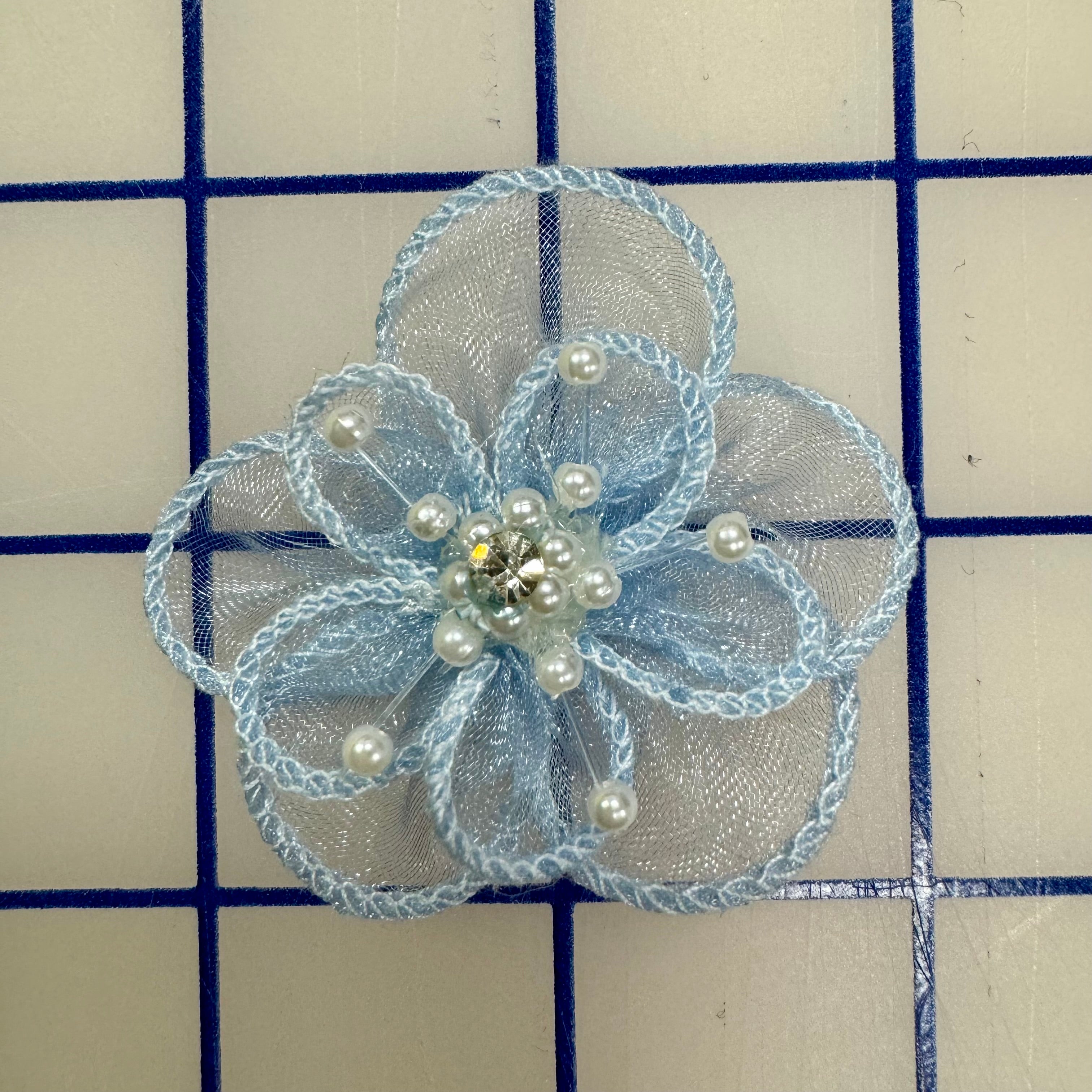 Priced per flower. Light Blue organza flower, with pearls and center crystal. Easily dyeable. 10% discount per dozen of same color.