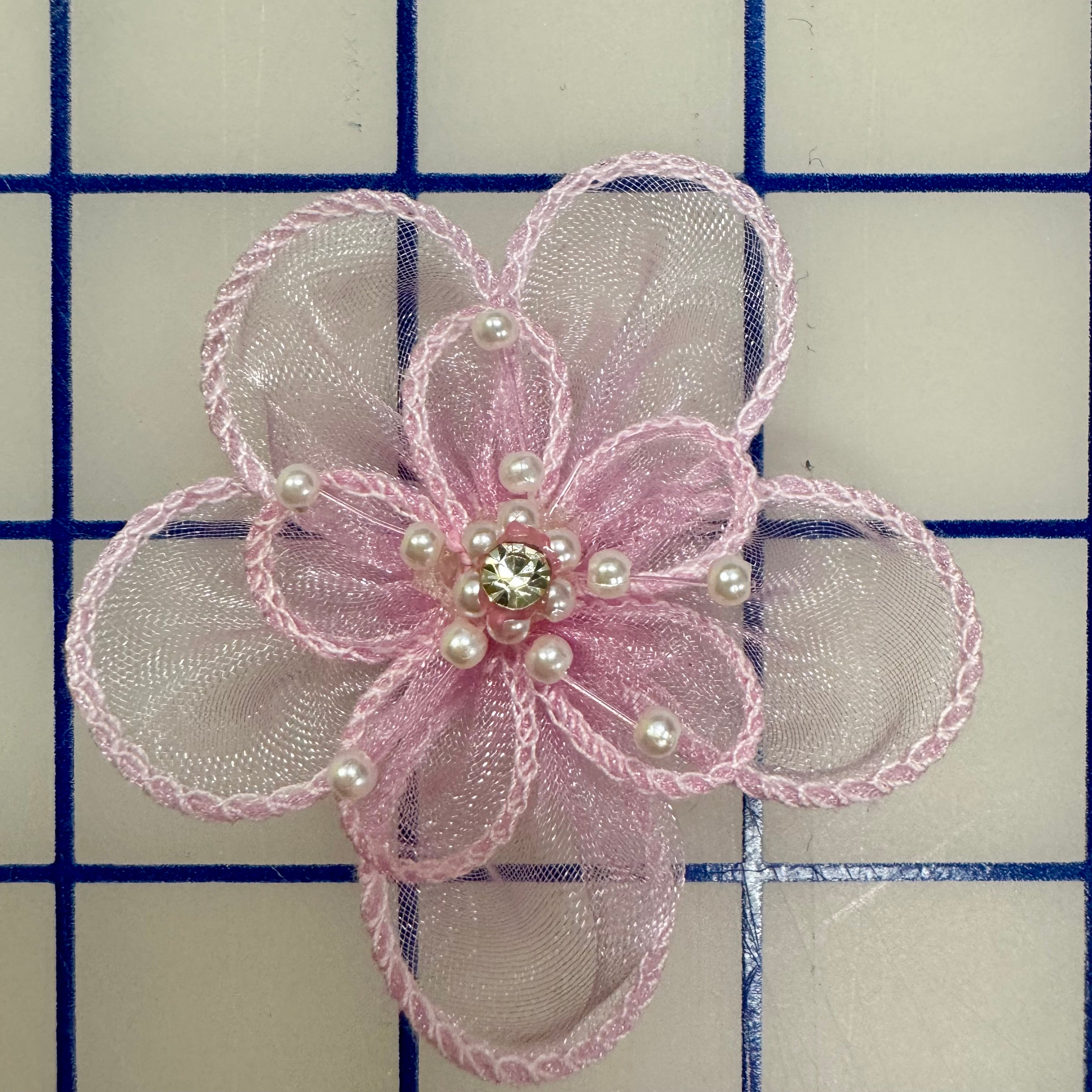 Priced per flower. Pink organza flower, with pearls and center crystal. 10% discount per dozen of same color.