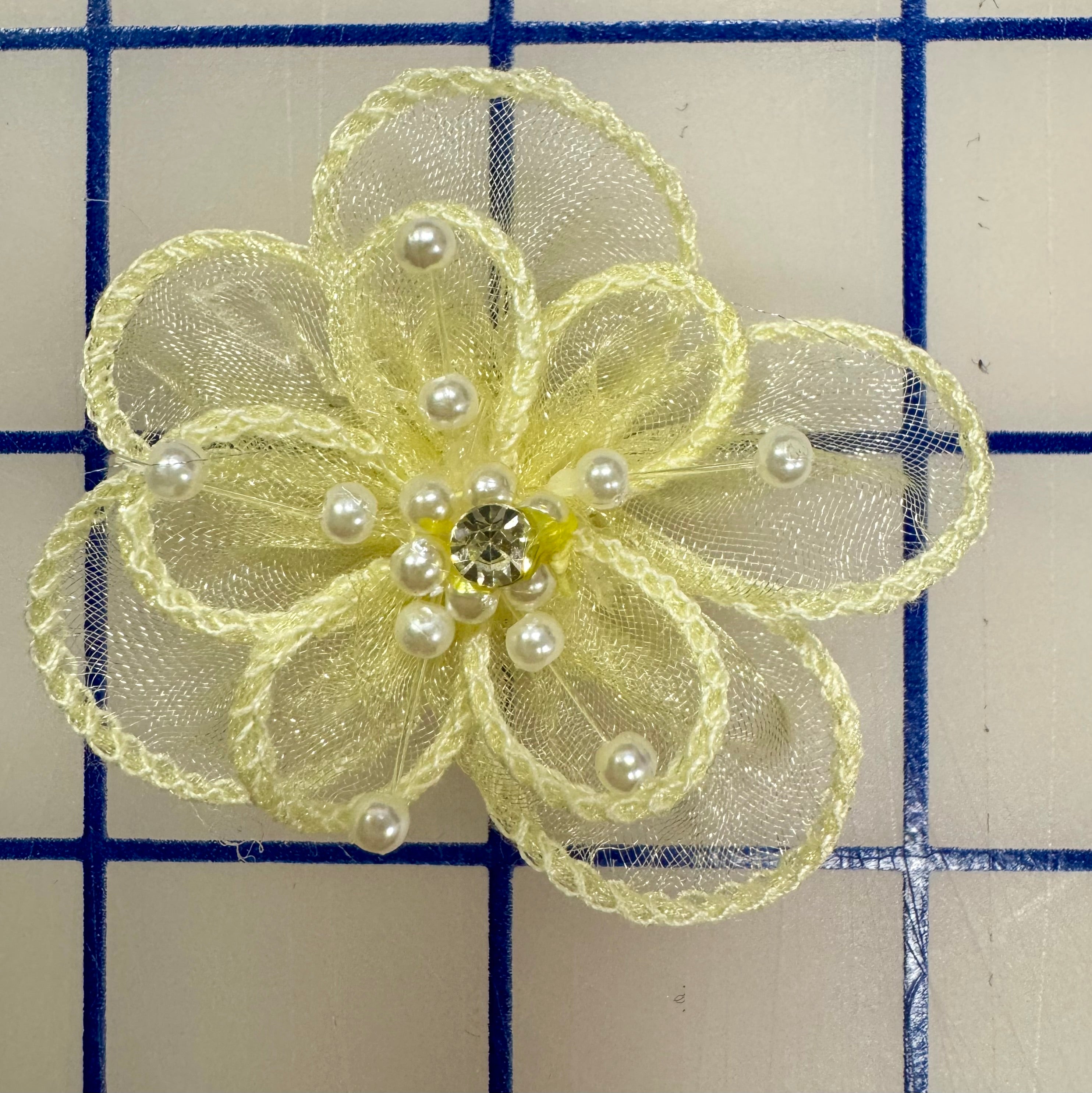 Priced per flower. Yellow organza flower, with pearls and center crystal. 10% discount per dozen of same color.