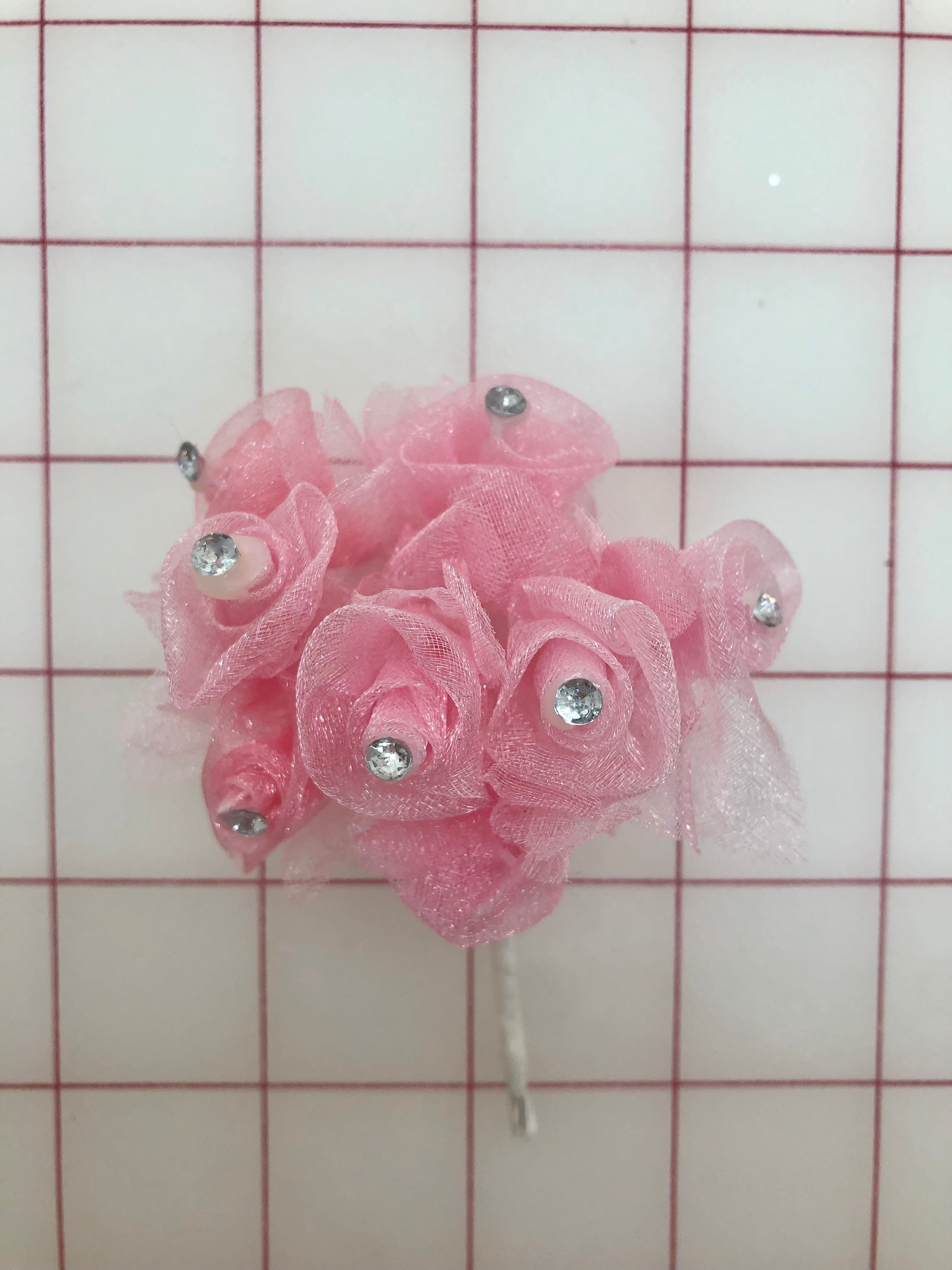 Priced per 9-flower bundle. Pink sparkle organza buds, with a crystal rhinestone in the center of each.