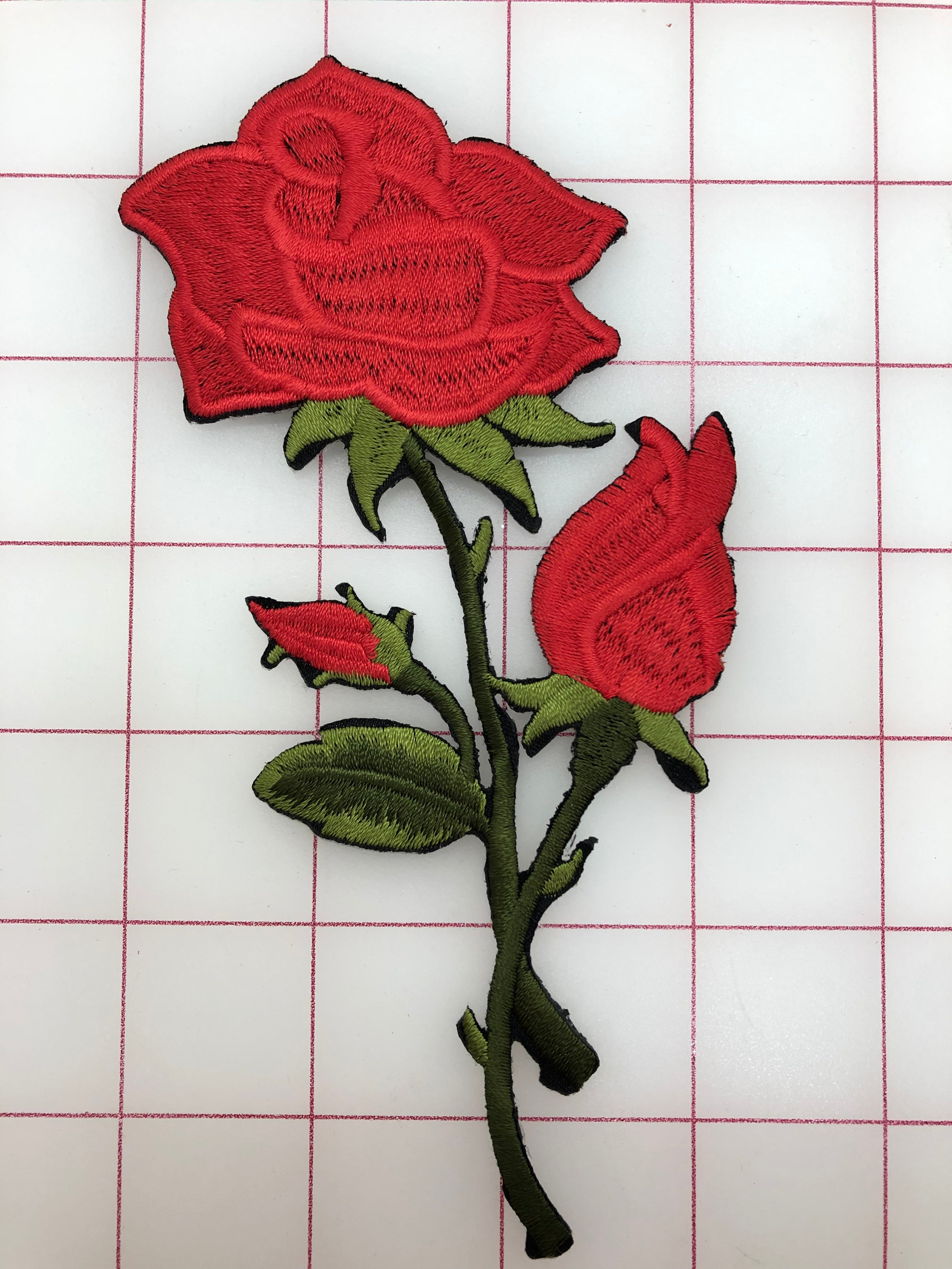 Priced per applique. Medium-size, embroidered, iron-on, red rose and buds, with green leaves. Perfect for use on an "Awakening of Flora" dress! 10% discount per full dozen.