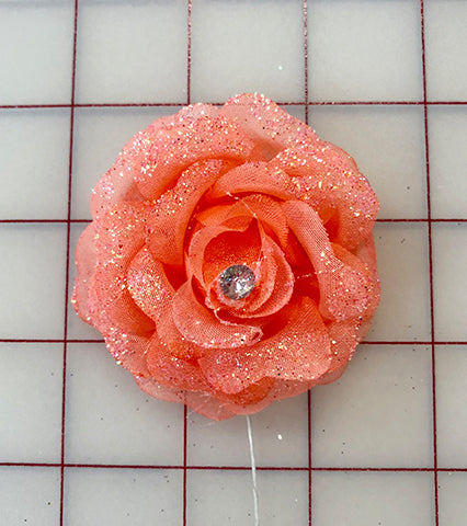 Priced per piece.  Beautiful, sparkly organza rose with glitter and a rhinestone center.