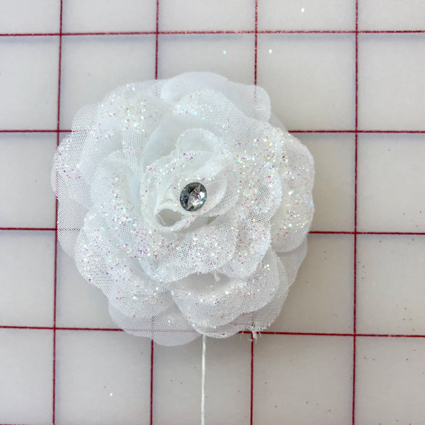 Priced per piece.  Beautiful, sparkly organza rose with glitter and a rhinestone center.