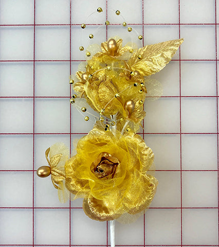 Priced per piece. Gold metallic roses with rosebuds and pearls. Makes a beautiful side-of-the-bun headpiece! Smallest quantity sold: one piece.