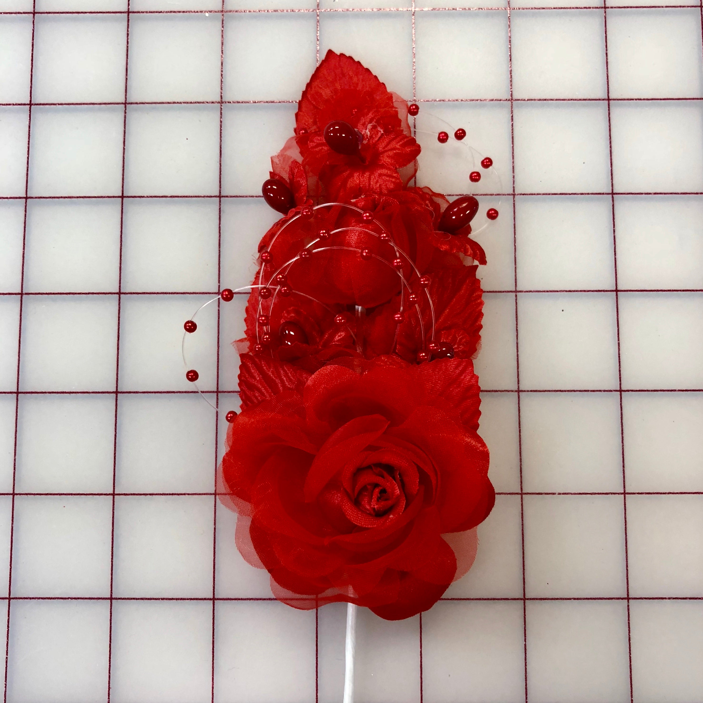 Priced per piece. Red roses with rosebuds and pearls. Makes a beautiful side-of-the-bun headpiece! Smallest quantity sold: one piece.