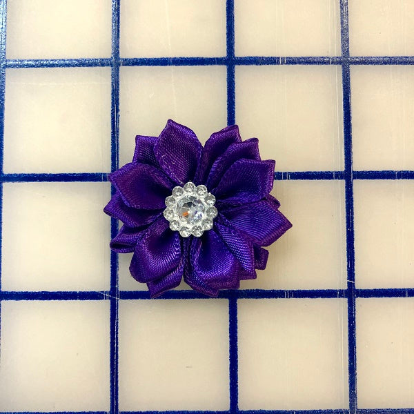 Priced per piece. Beautiful purple satin flowers with rhinestone center.