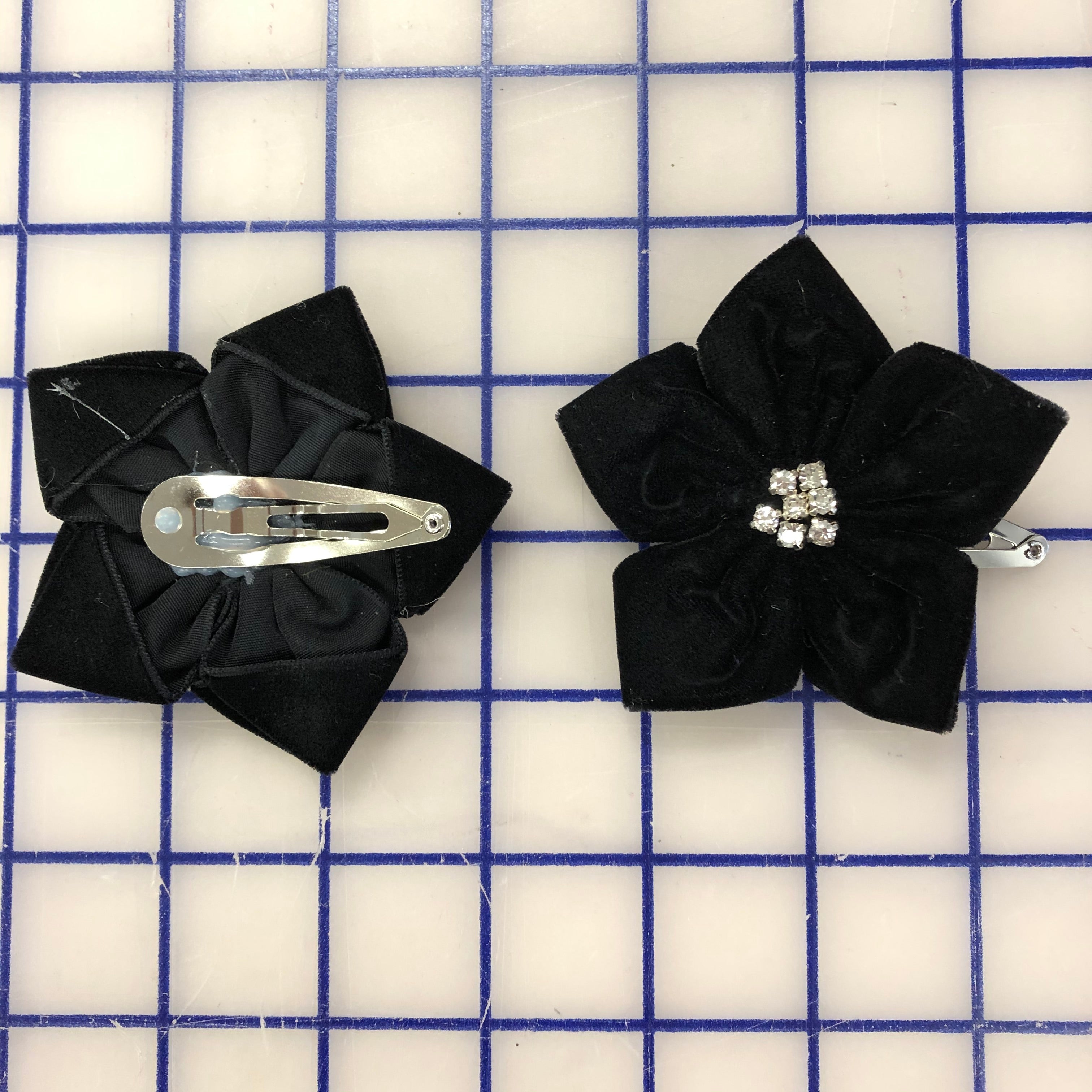 Priced each. Beautiful, black velvet flower hairclip with crystal rhinestones. Perfect finishing touch. Makes a beautiful headpiece. Can also be used to embellish tutus and other costumes. Perfect for Satanella tutus. For size: One square equals one inch.