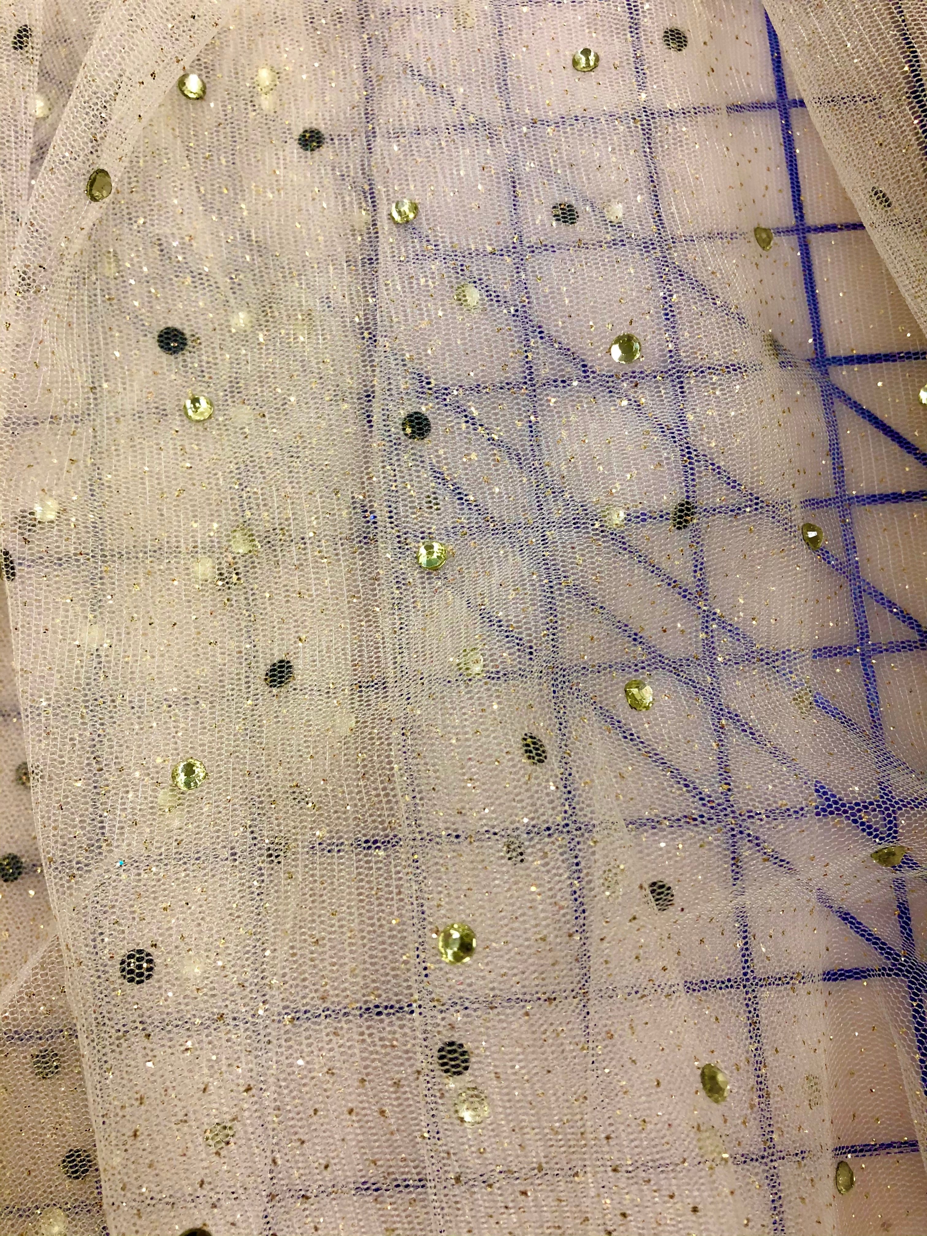 Priced per yard.Ivory/Lt. Colorado Topaz glitter net with rhinestones. 60-inches wide. Perfect for Sugar Plum fairy tutus, many other costumes, and bridal.  Net has a soft hand, but not as soft as many domestic tulles.  Perfect for a top layer or a plate on a tutu.  Smallest length sold online: One yard.