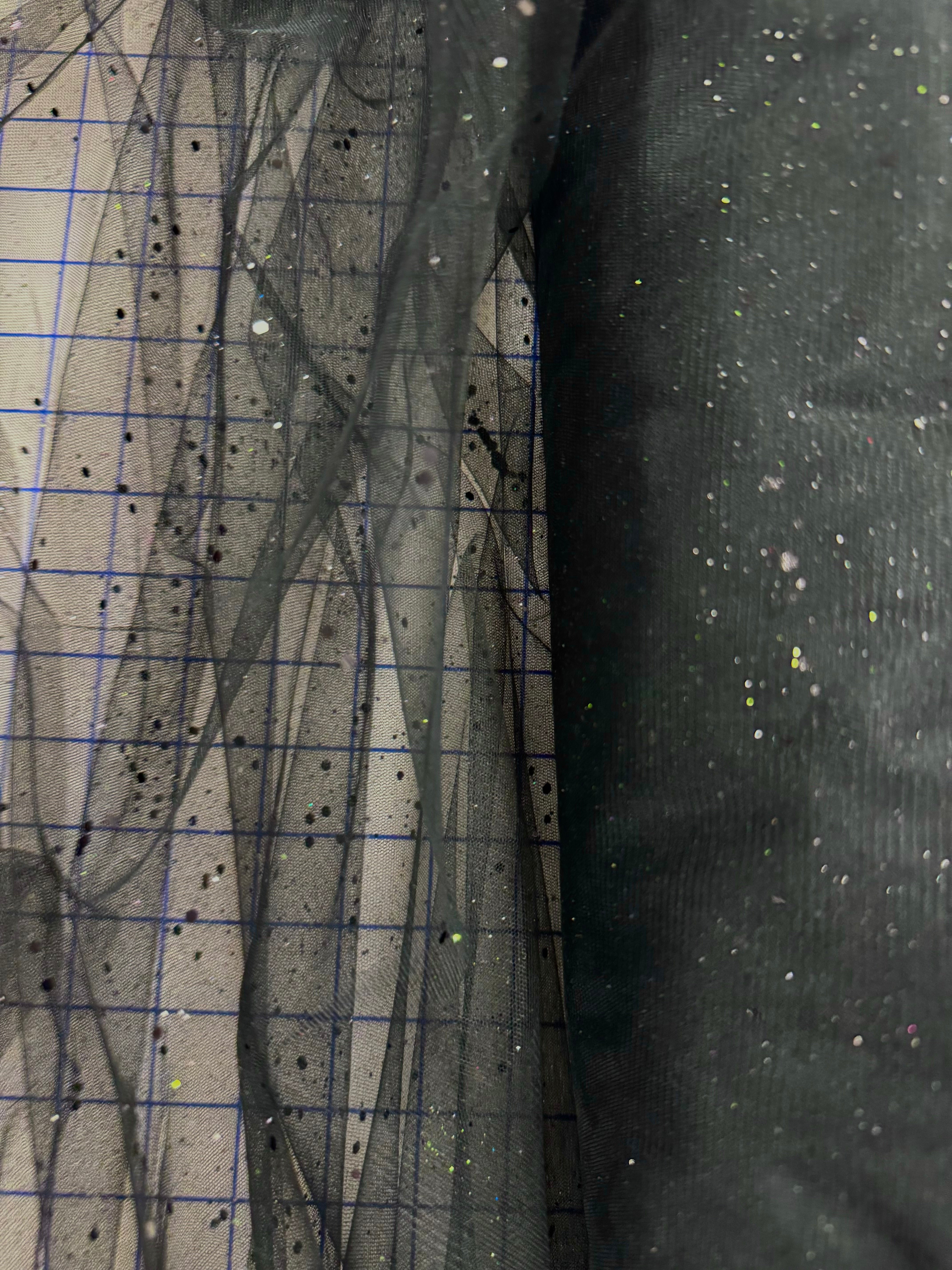 Priced per yard. Black glitter sequined tulle. This tulle does have some glitter shed, but not as much as some we have previously stocked. The sequins do not shed. We suggest shaking it out before cutting. 58/60-inches wide.