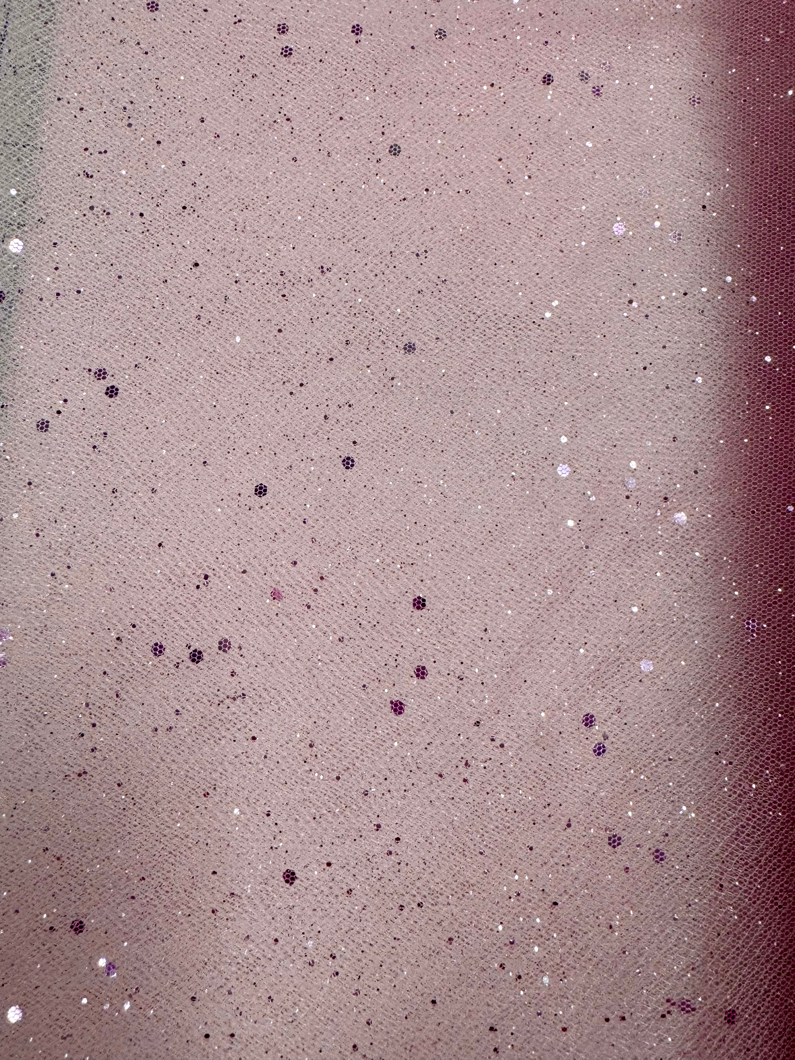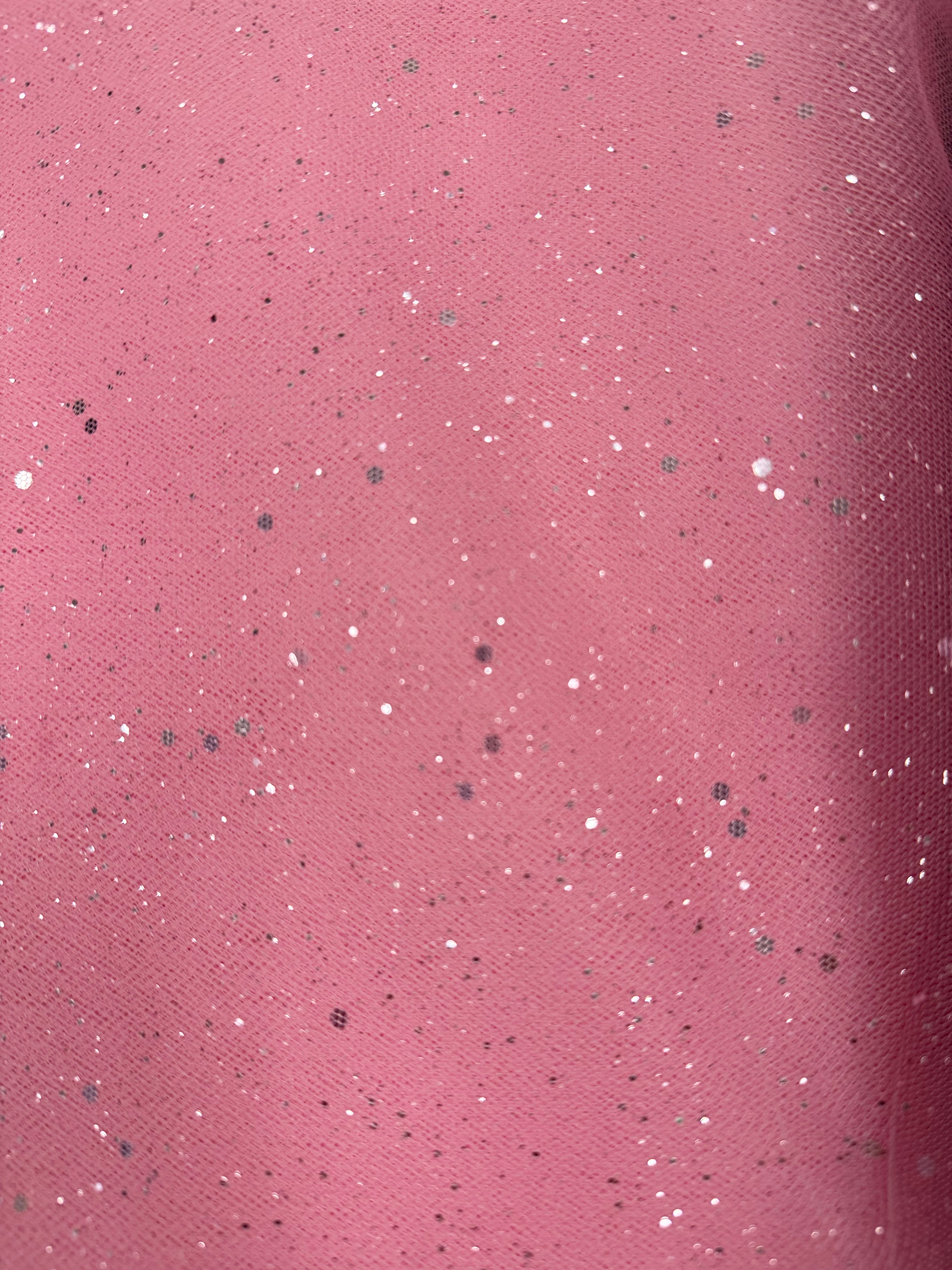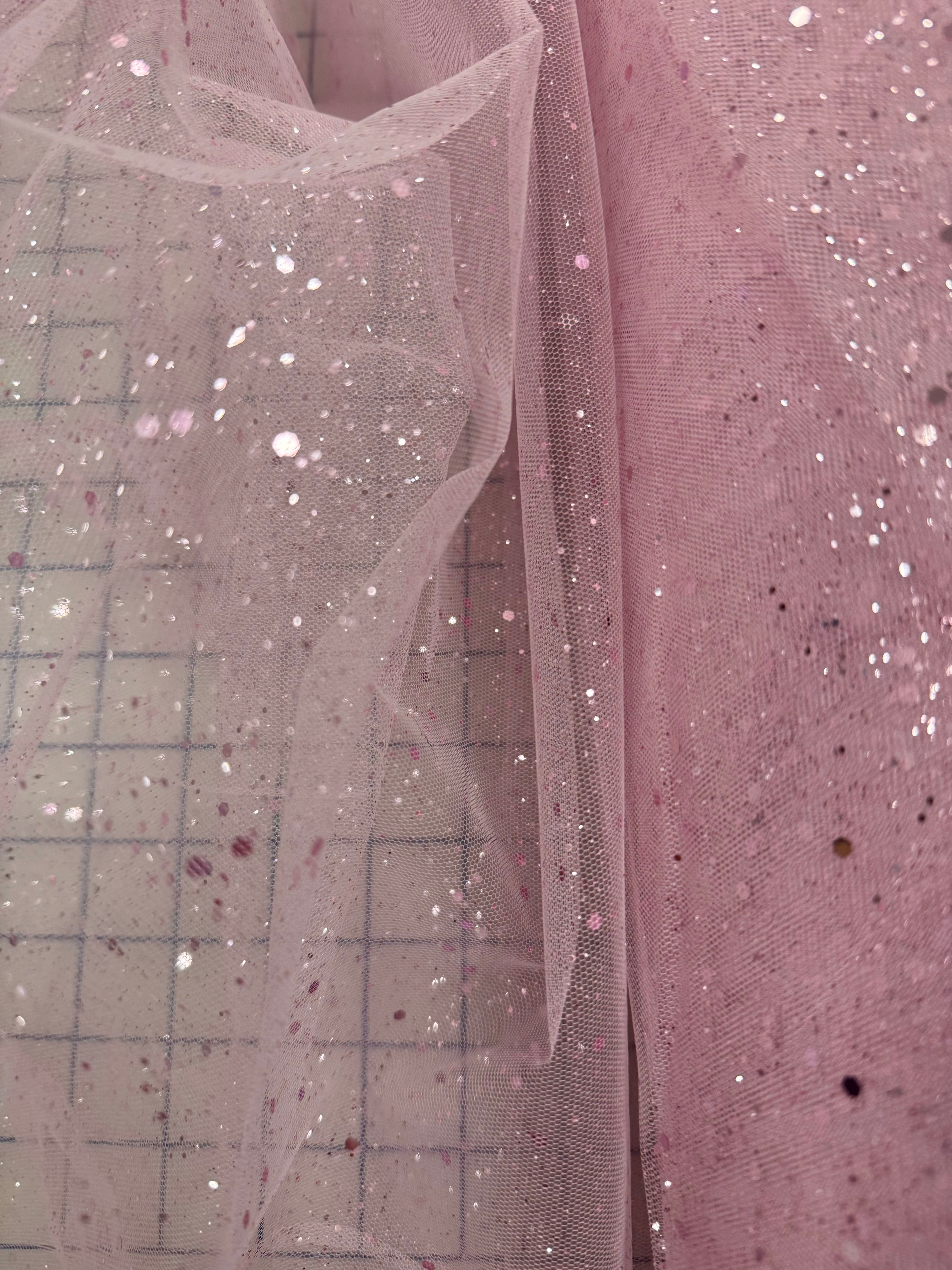 Priced per yard. Pink glitter hologram mesh sequined tulle. This tulle does have some glitter shed, but not as much as some we have previously stocked. The hologram sequins do not shed. We suggest shaking it out before starting a project. 58/60-inches wide.