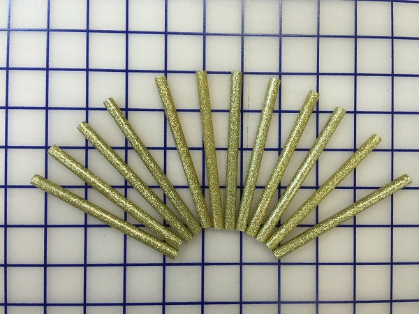 Priced per dozen.. Gold. Thin glitter glue sticks. One-dozen packs. 10% Discount per 1/2 gross (72 pieces). 20% discount per full gross (144 pieces). Great for gluing the wires on custom-made tiaras.