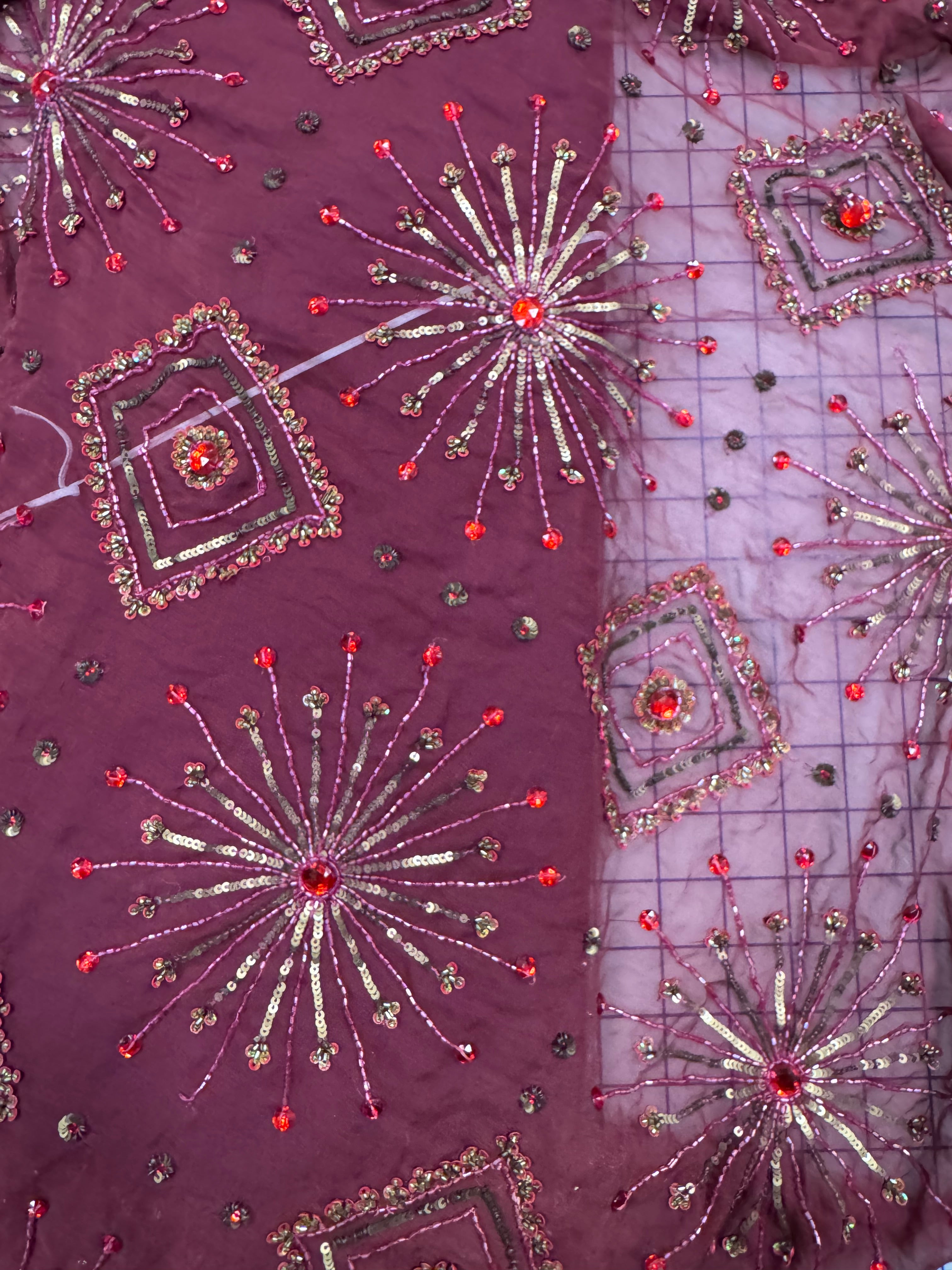 Priced per 3/4-yard/44-inch wide piece and a 3.66-yard/11-inch wide piece. Sparkly burgundy beaded and sequined silk chiffon pieces. Perfect for use in many costumes - Nutcracker Arabian, Gamzatti, etc.