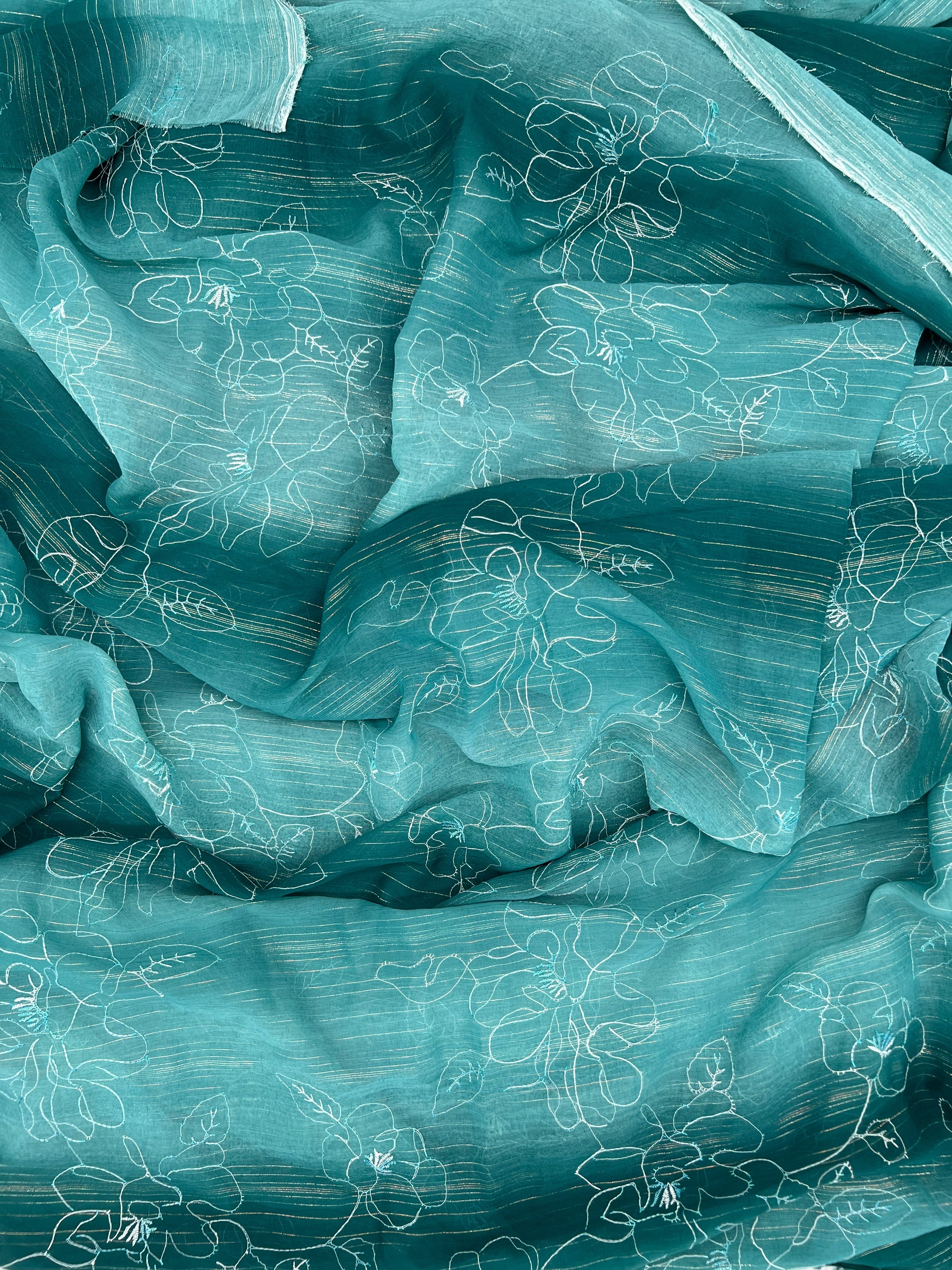 Priced per yard. Gorgeous, Greenish/blue chiffon. 48-inches wide, with delicate white flower design and tiny gold metallic threads.