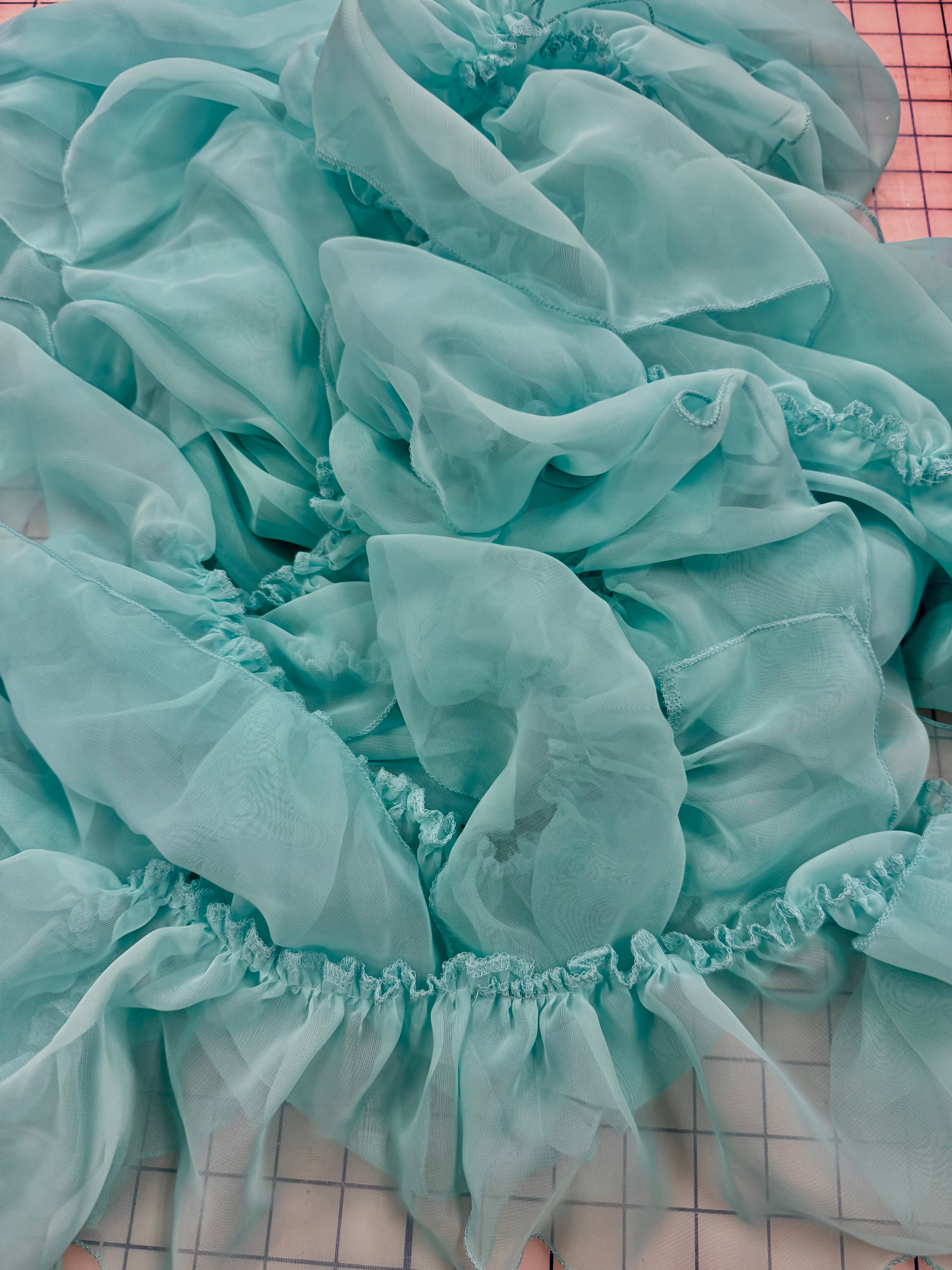 Priced per grab bag. Aqua Chiffon pieces ruffled and roll-hemmed. Petal-cut shaped.