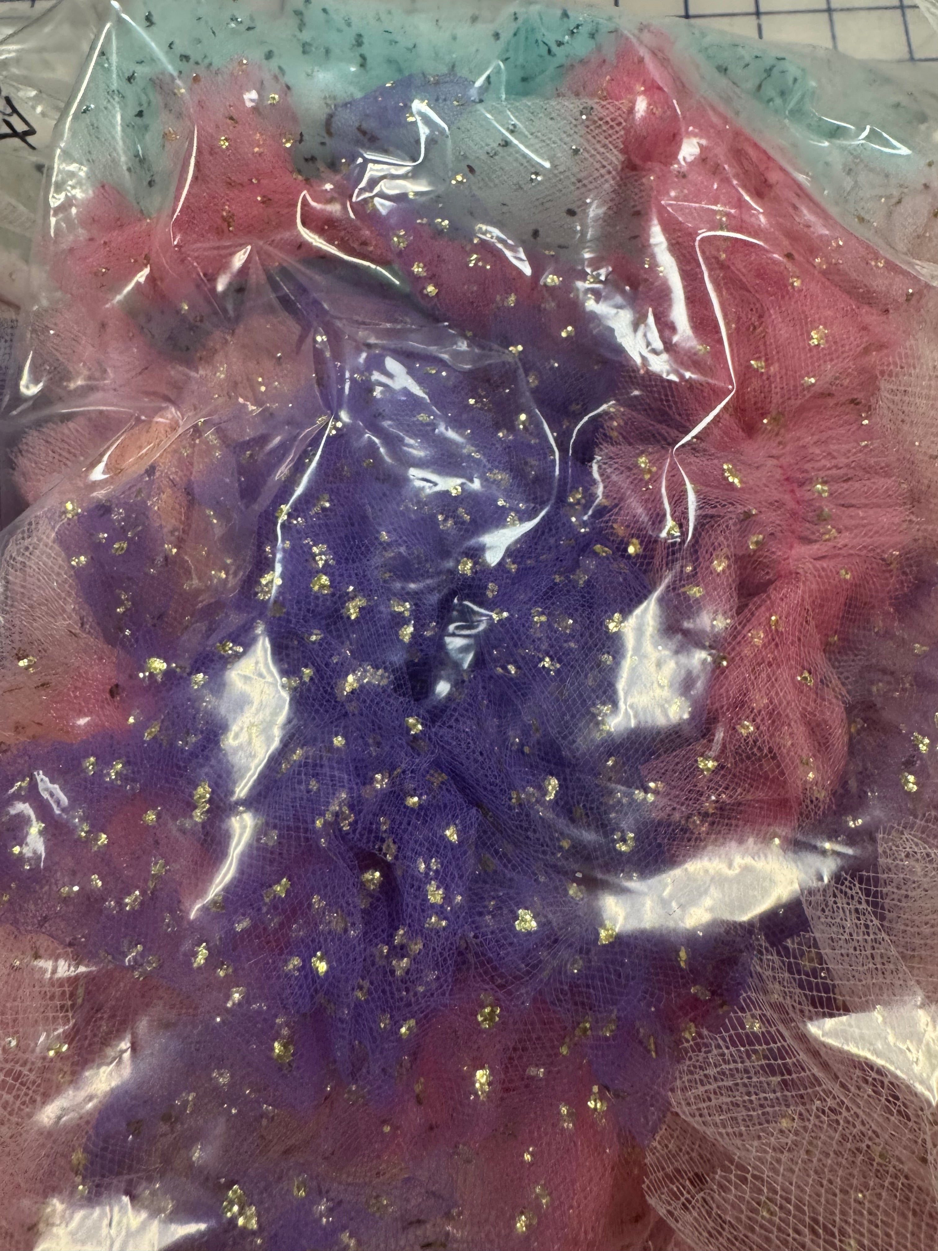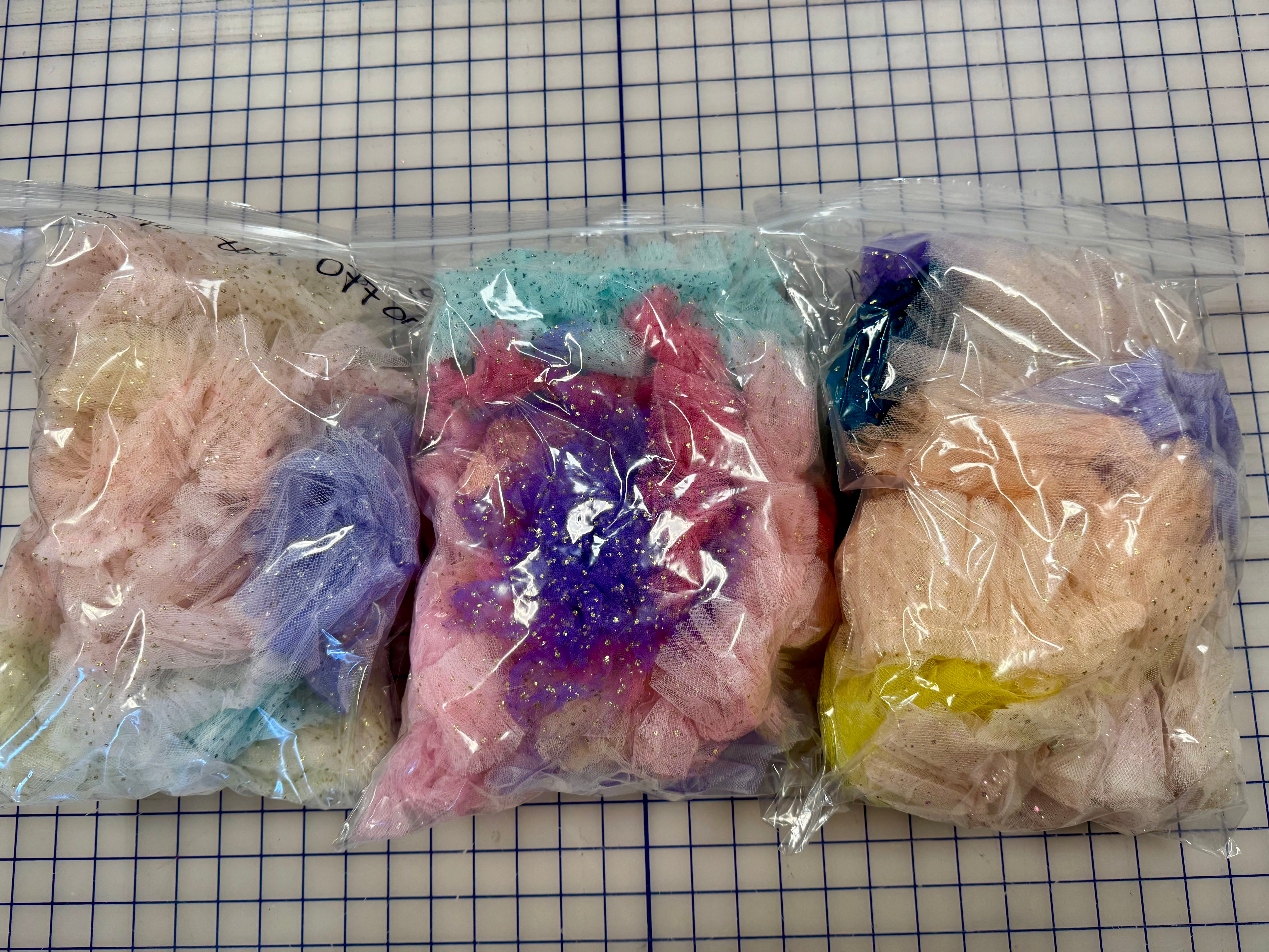 Priced per bag. Assorted pre-ruffled bum/panty ruffles of net mixed with sparkle tulle.