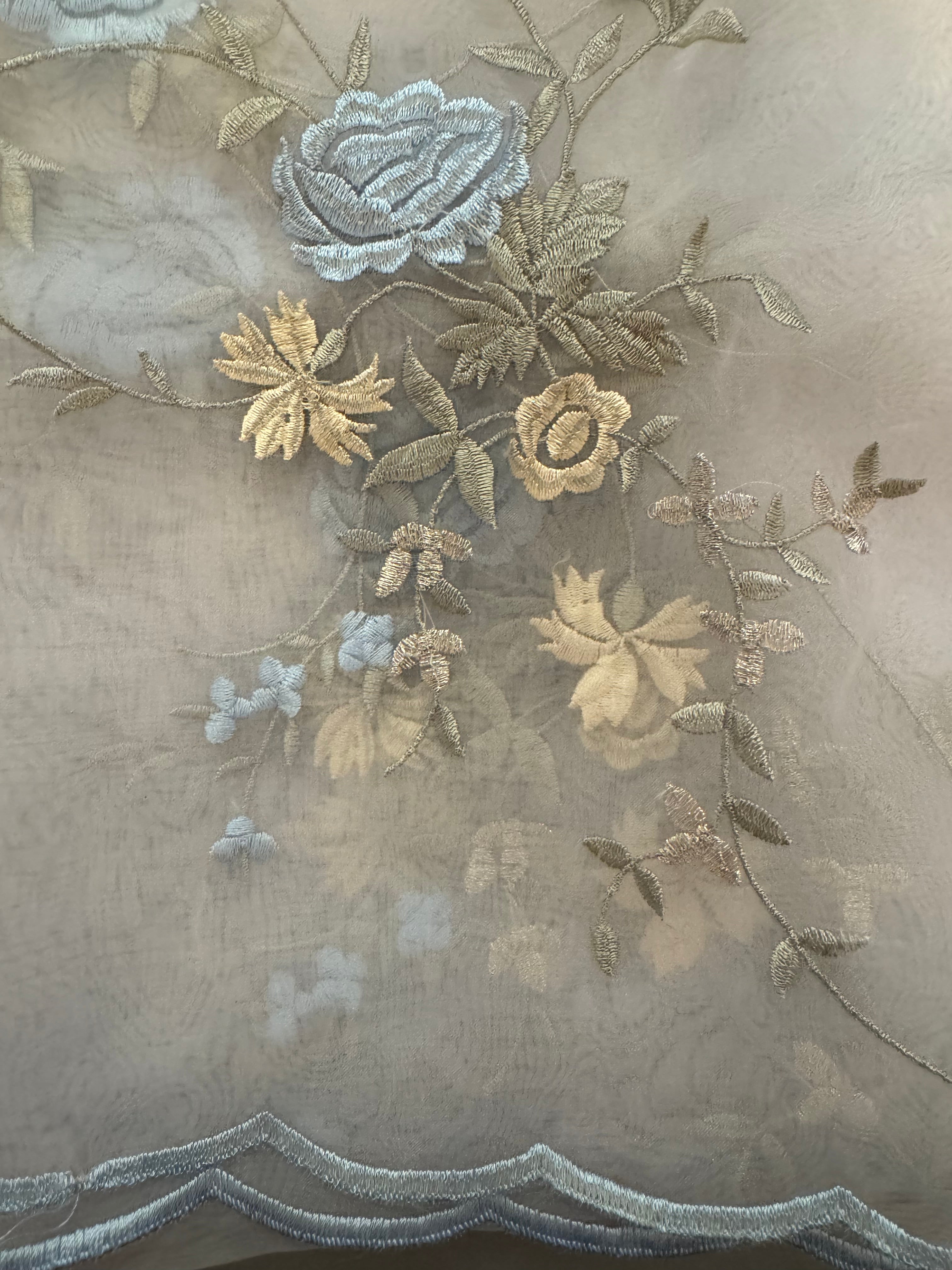 Priced per 1/2-yard + grab bag. Embroidered organza with blue, green and ivory flower design.