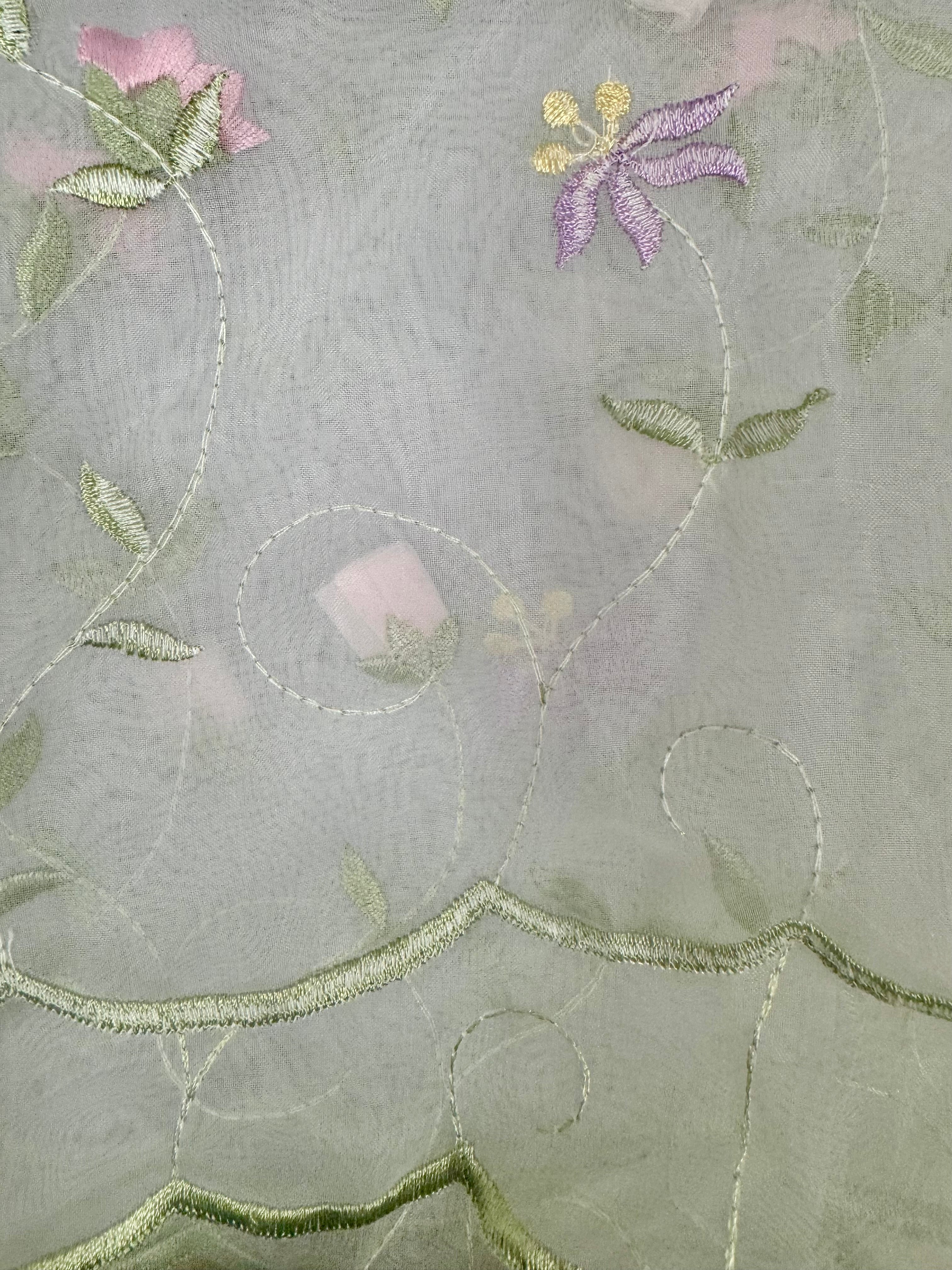 Priced per 1.75-yard/13 to15-inch wide piece, White organza with embroidered flowers in lilac and pink.